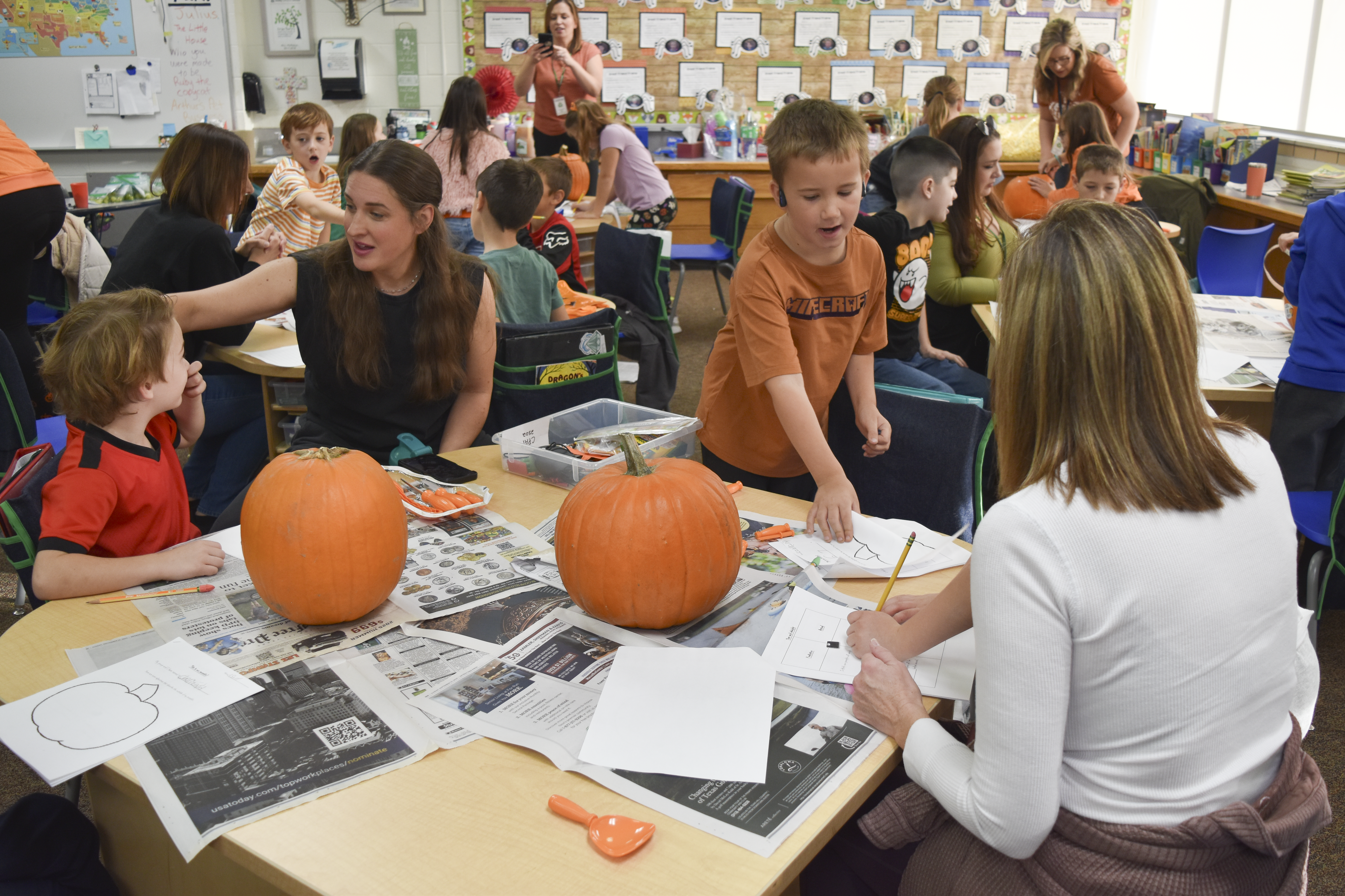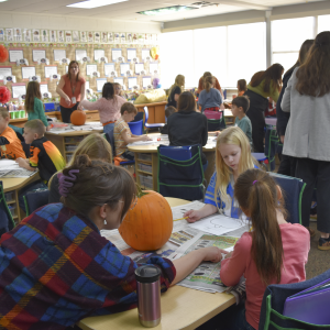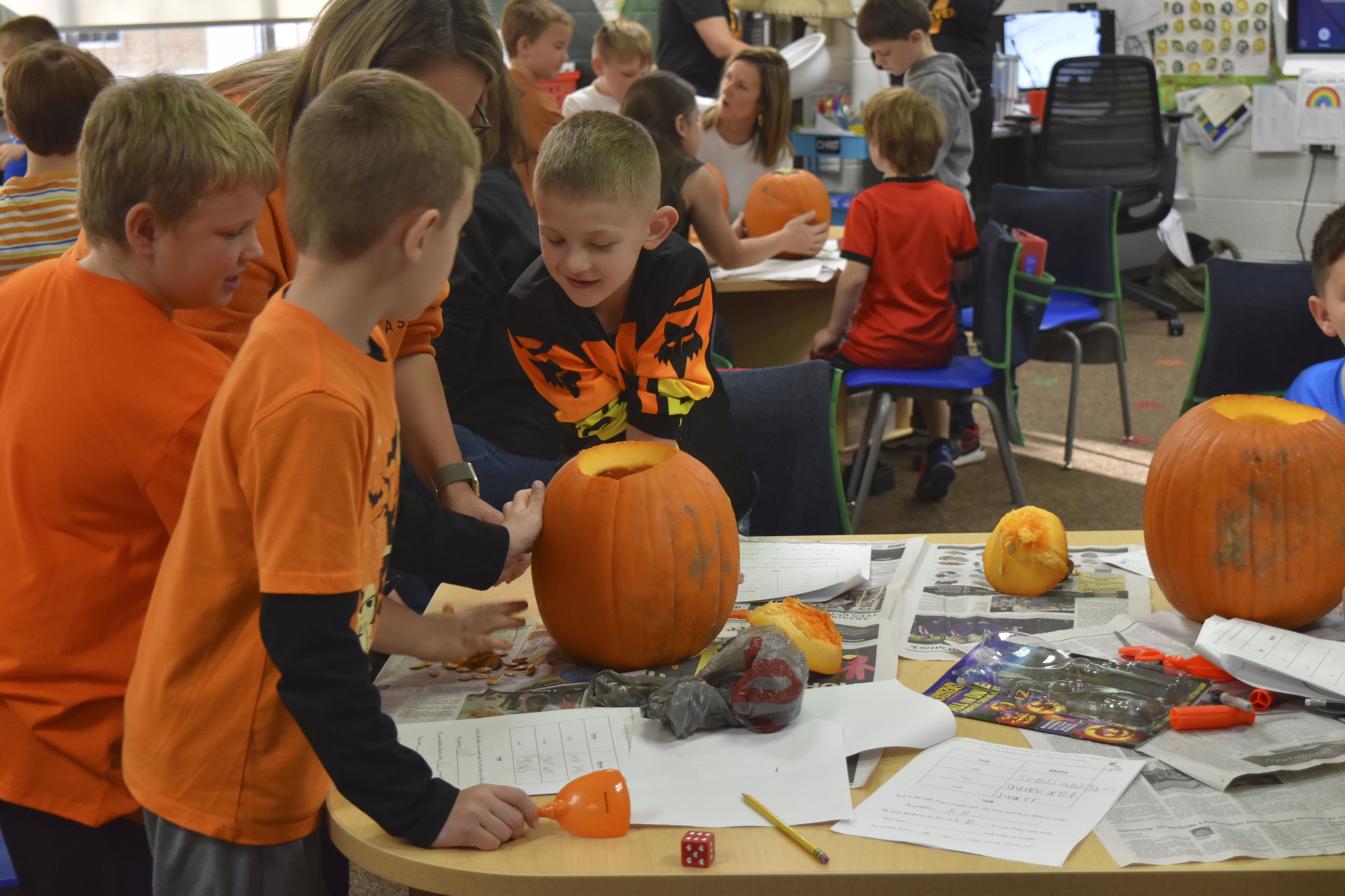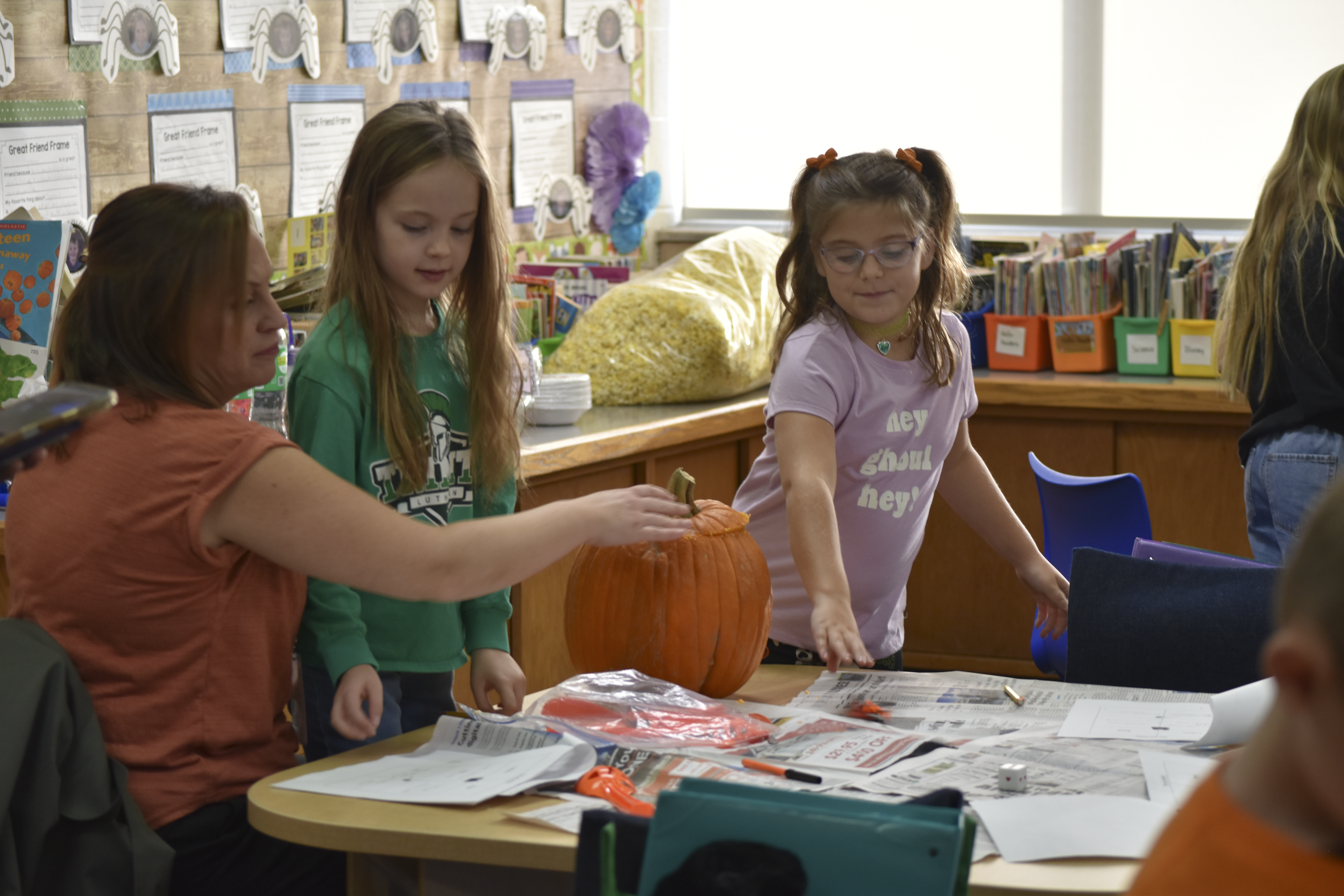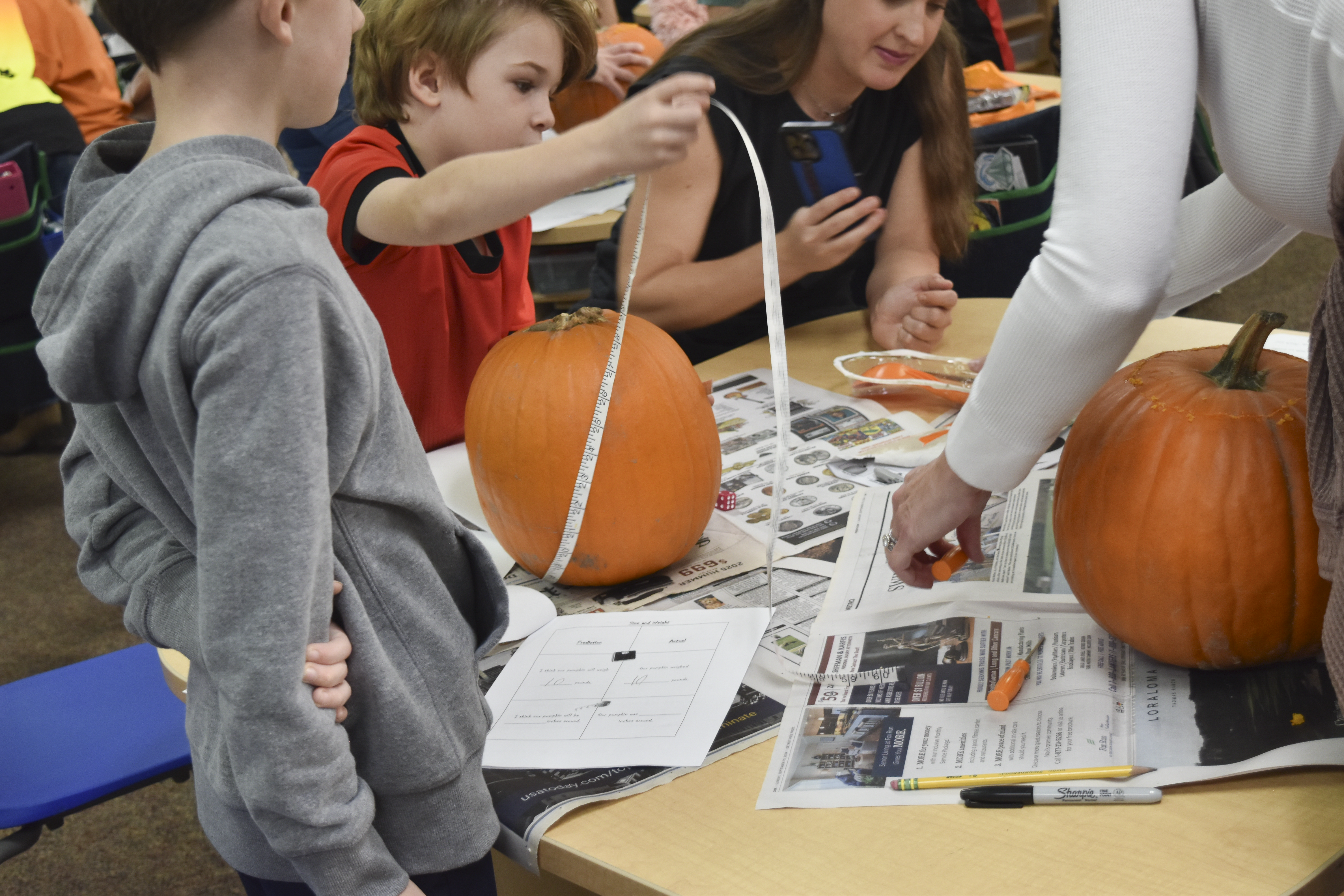 Students were divided into groups to work hands on with a pumpkin and overseen by parent volunteers. The students measured the pumpkins with tape measures, weighed their pumpkins on scales and then, the parent volunteers cut off the tops so the kids could see what was inside. They smelled the inside, touched the content and wrote down a description of what they found. Then came the hard work, they scraped the pumpkins out and separated the seeds. Grouping them into piles of fives, the students counted the seeds. One pumpkin provided so many opportunities for students to learn.