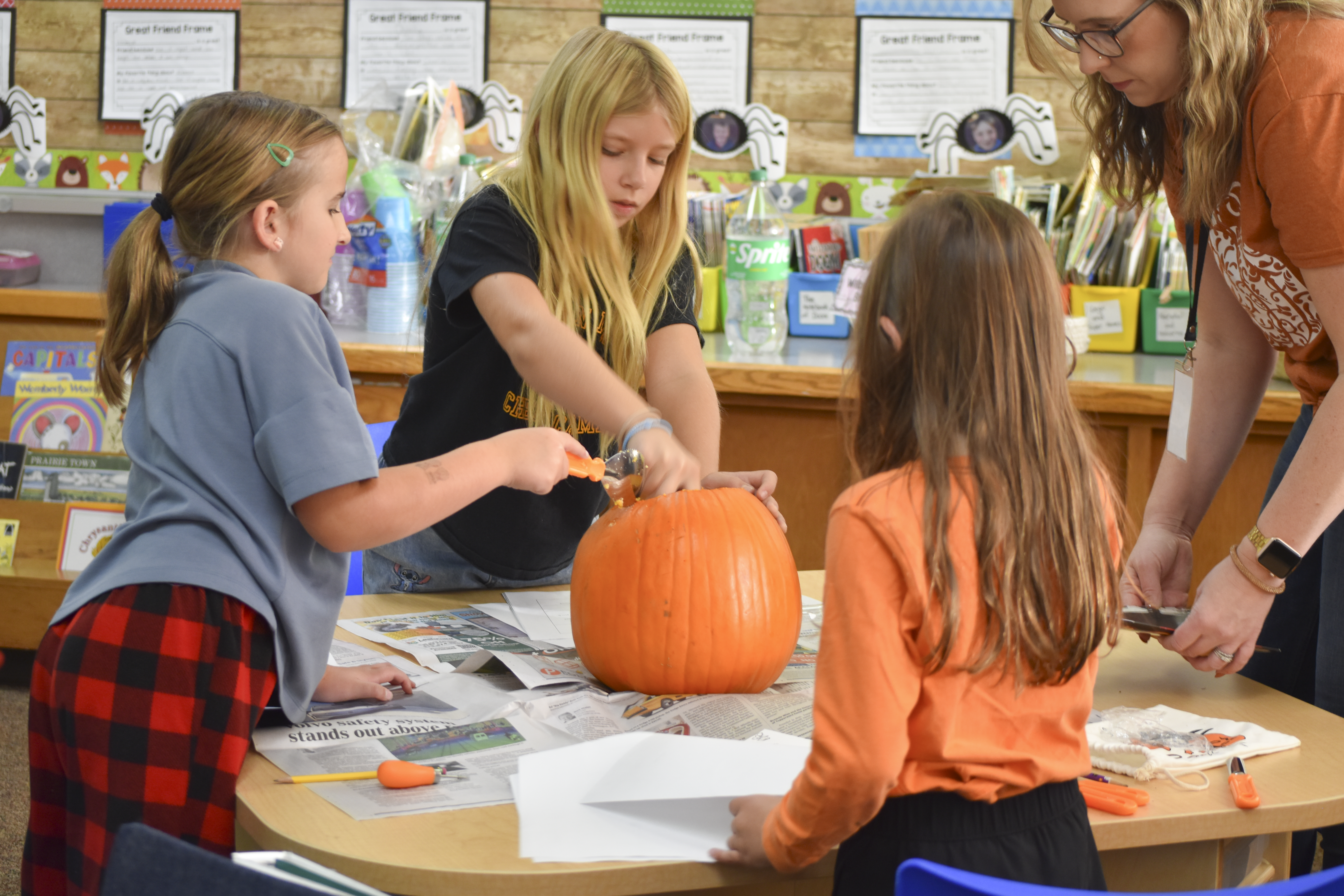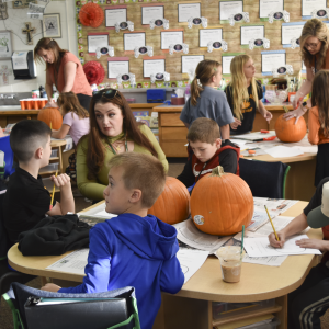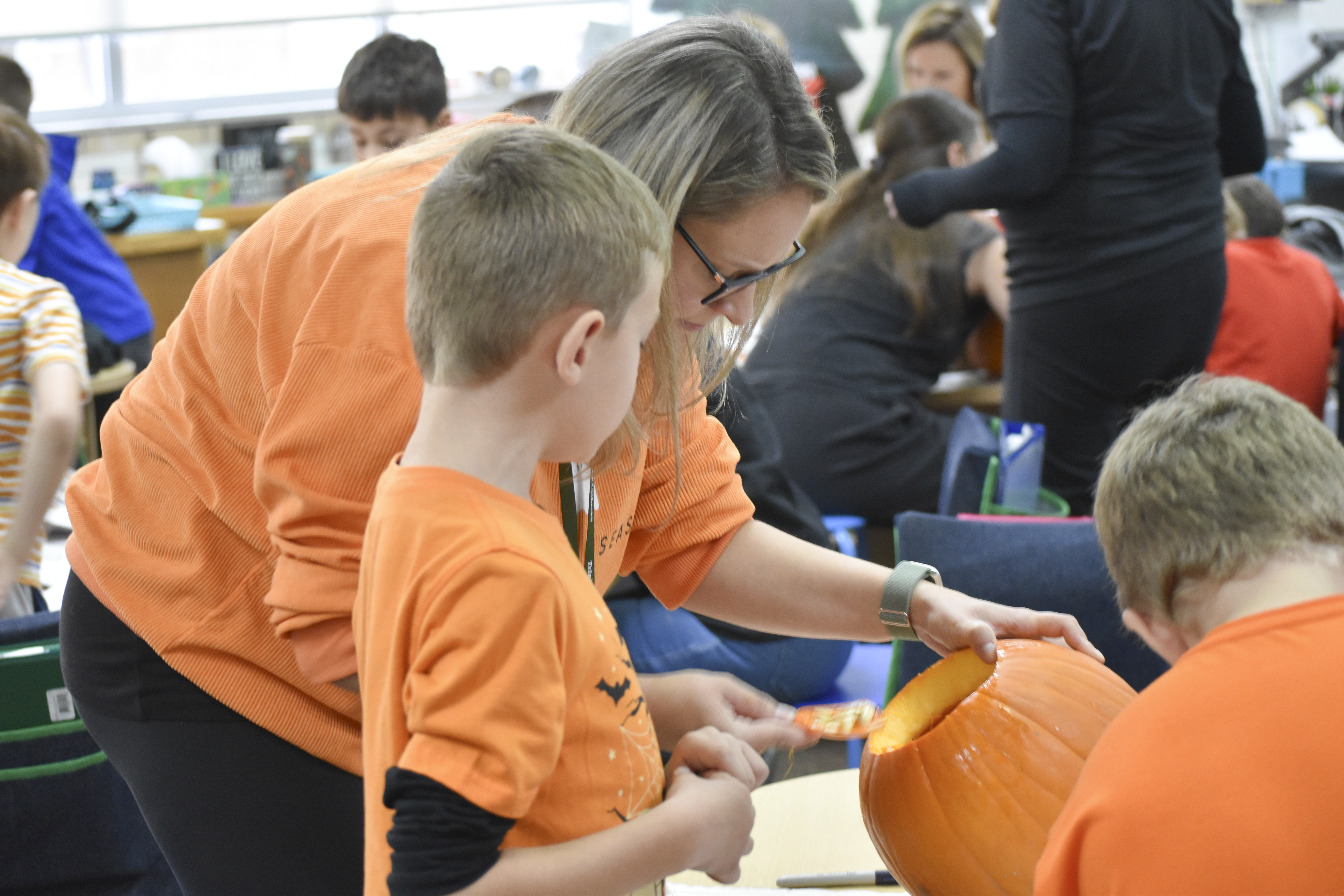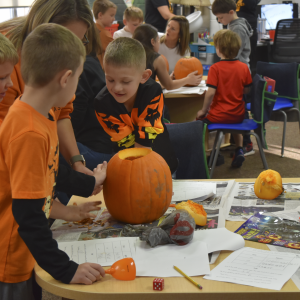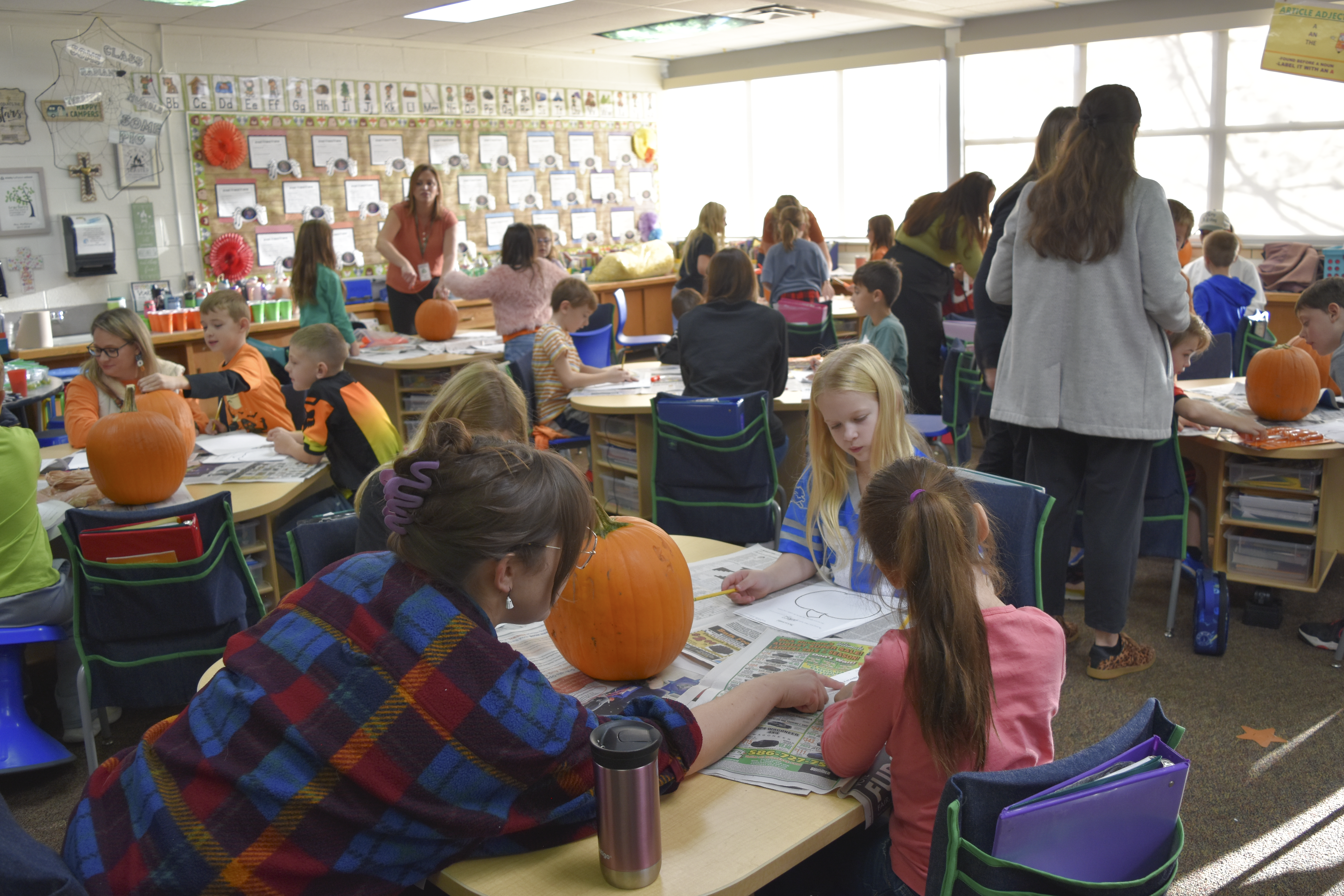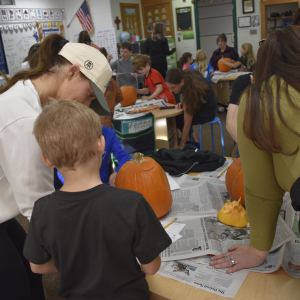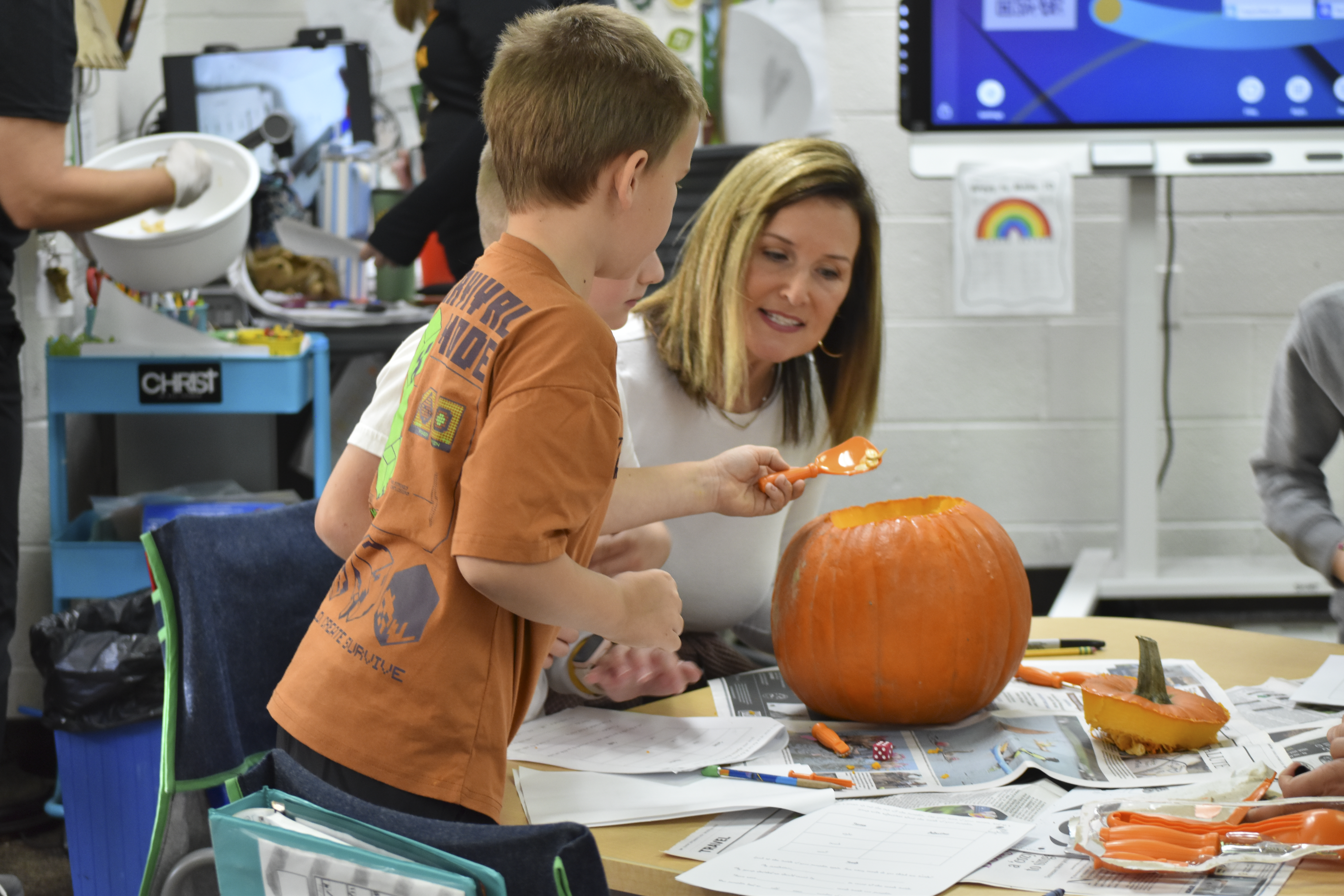 Students were divided into groups to work hands on with a pumpkin and overseen by parent volunteers. The students measured the pumpkins with tape measures, weighed their pumpkins on scales and then, the parent volunteers cut off the tops so the kids could see what was inside. They smelled the inside, touched the content and wrote down a description of what they found. Then came the hard work, they scraped the pumpkins out and separated the seeds. Grouping them into piles of fives, the students counted the seeds. One pumpkin provided so many opportunities for students to learn.