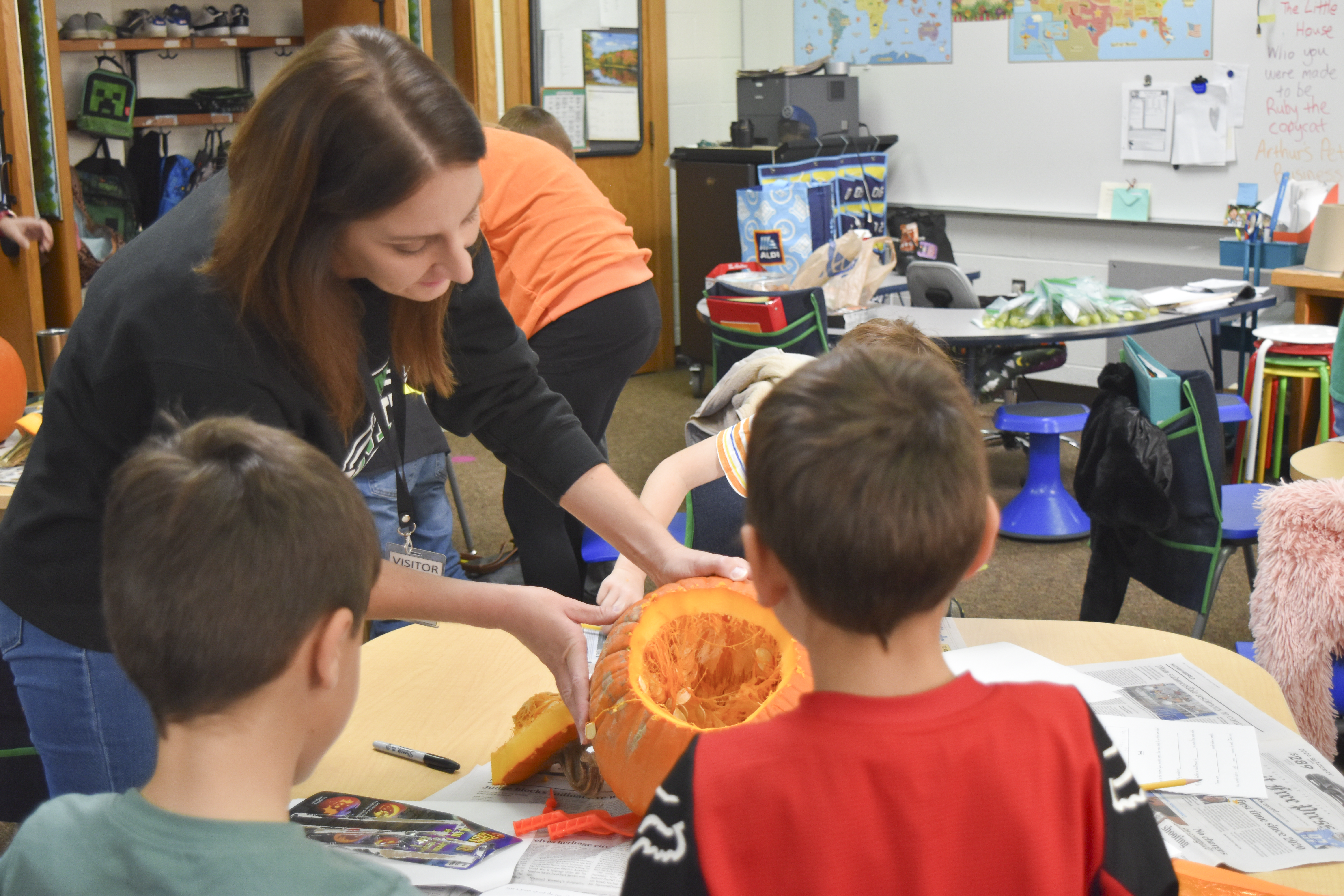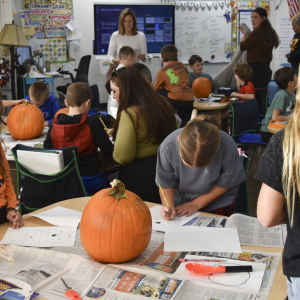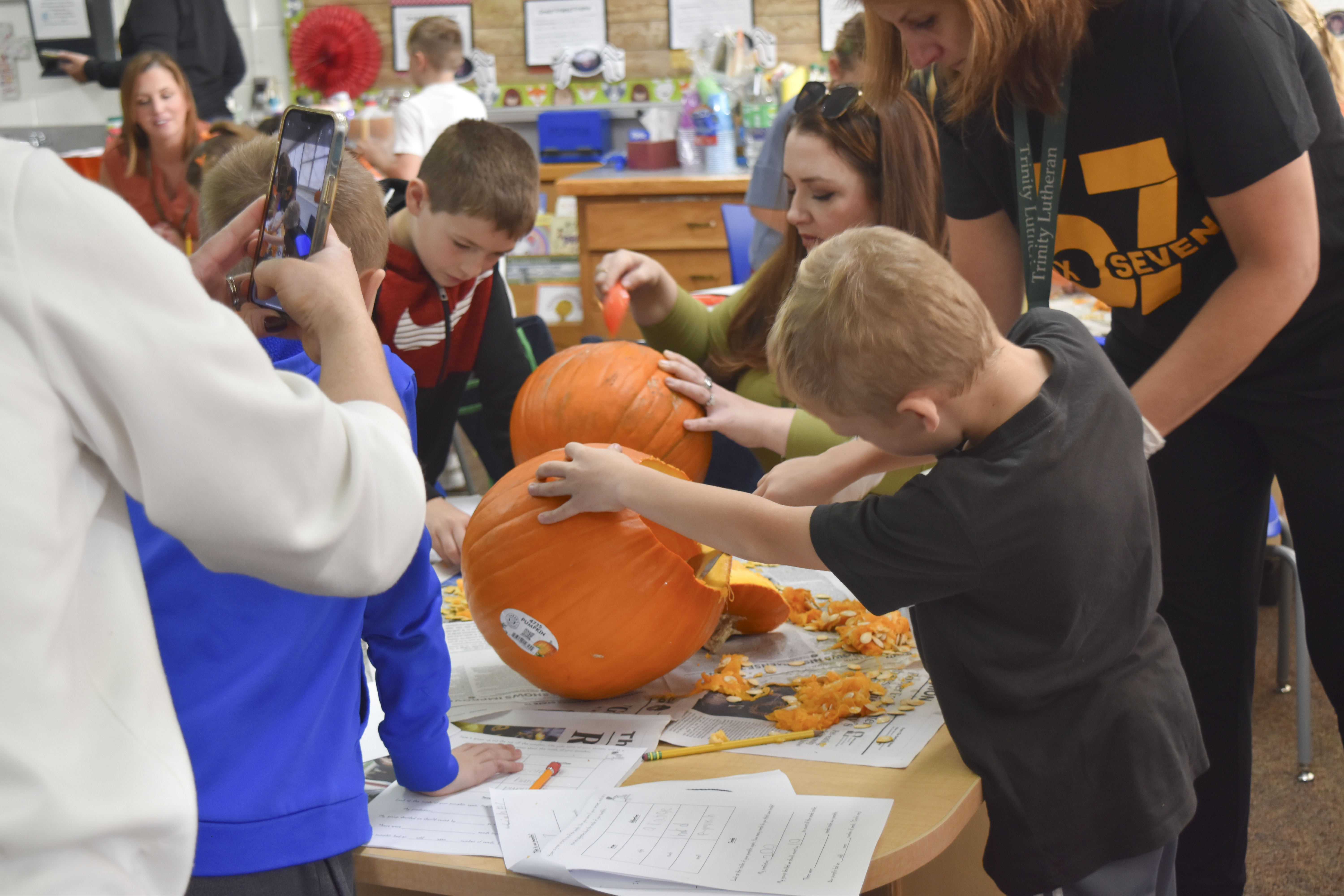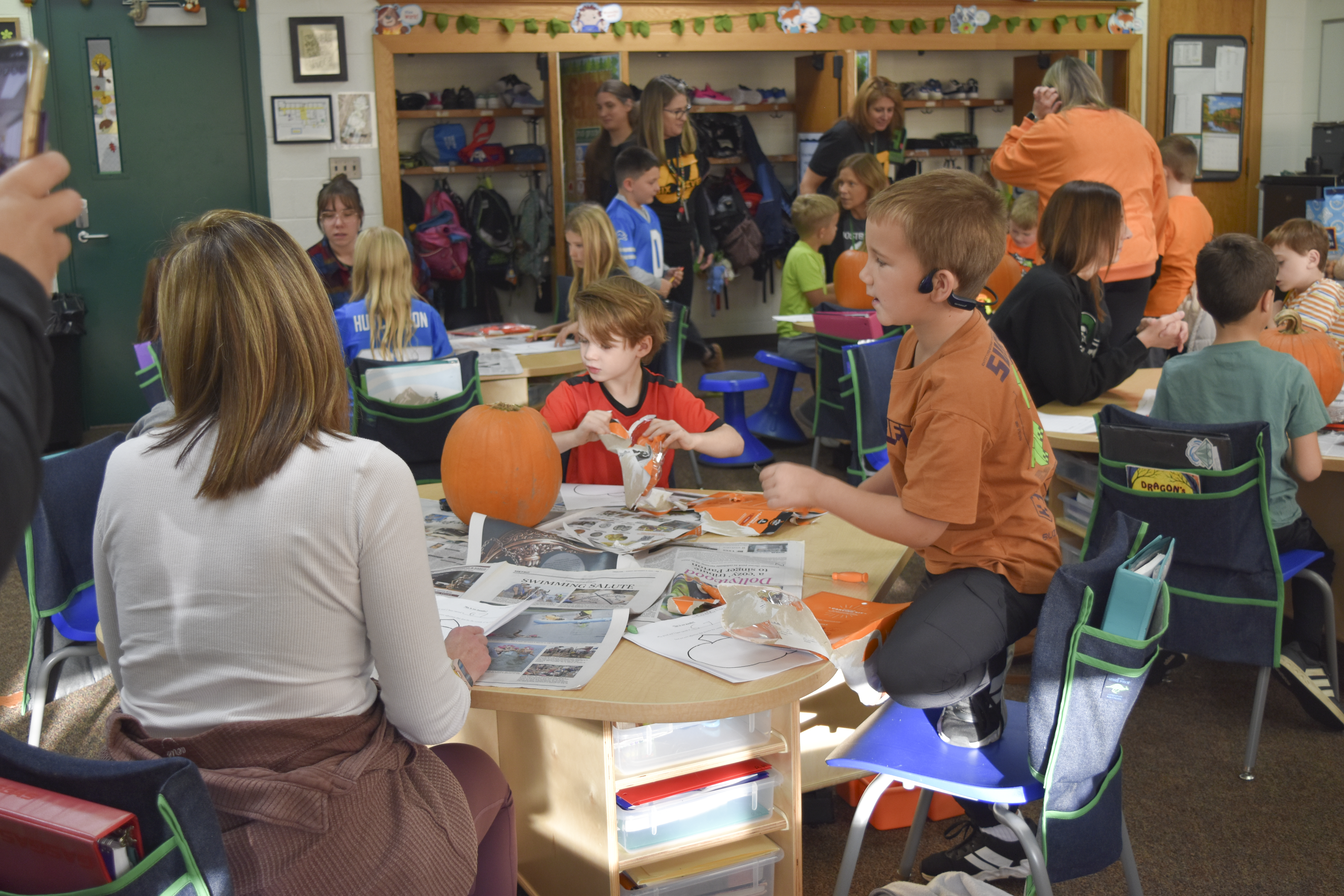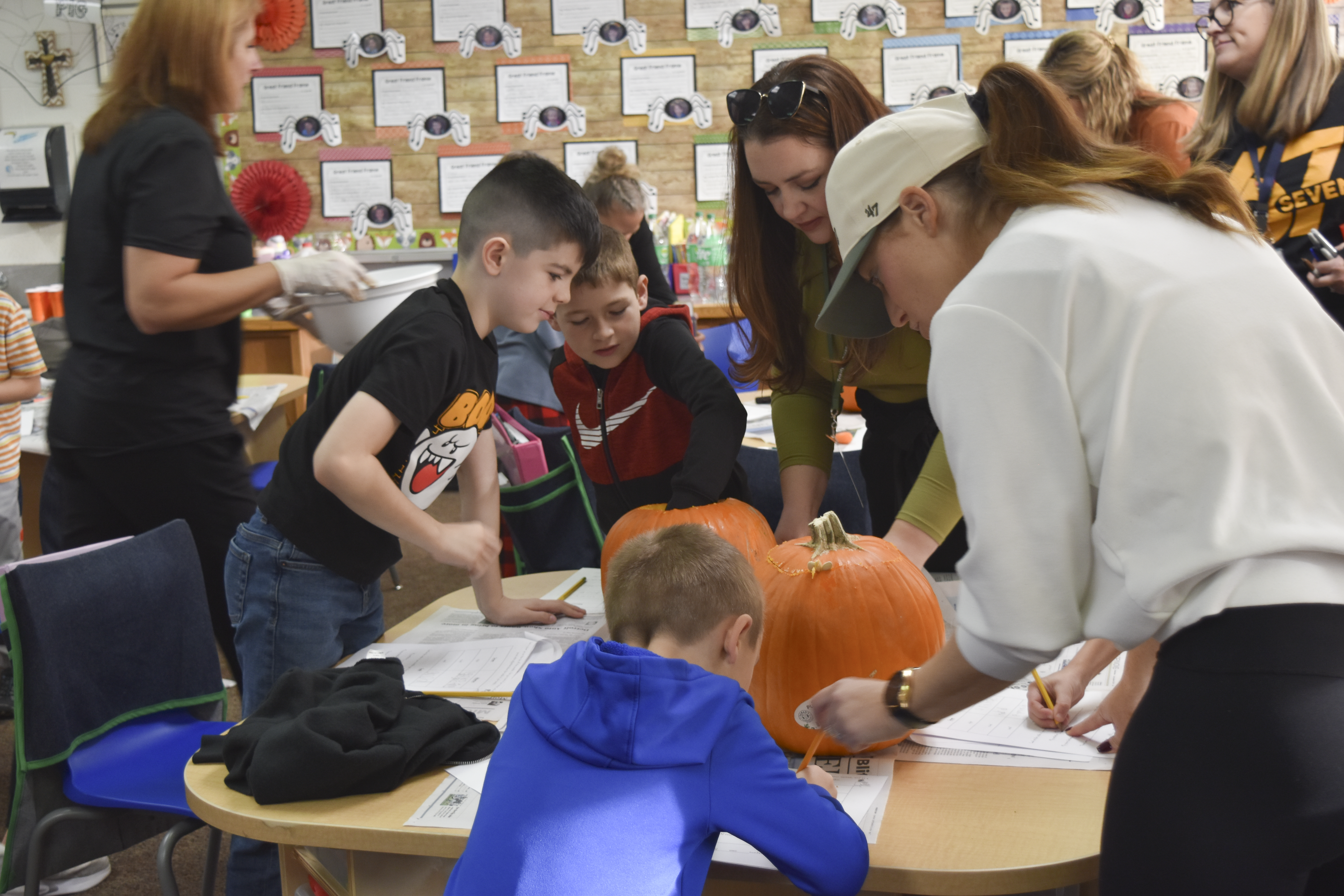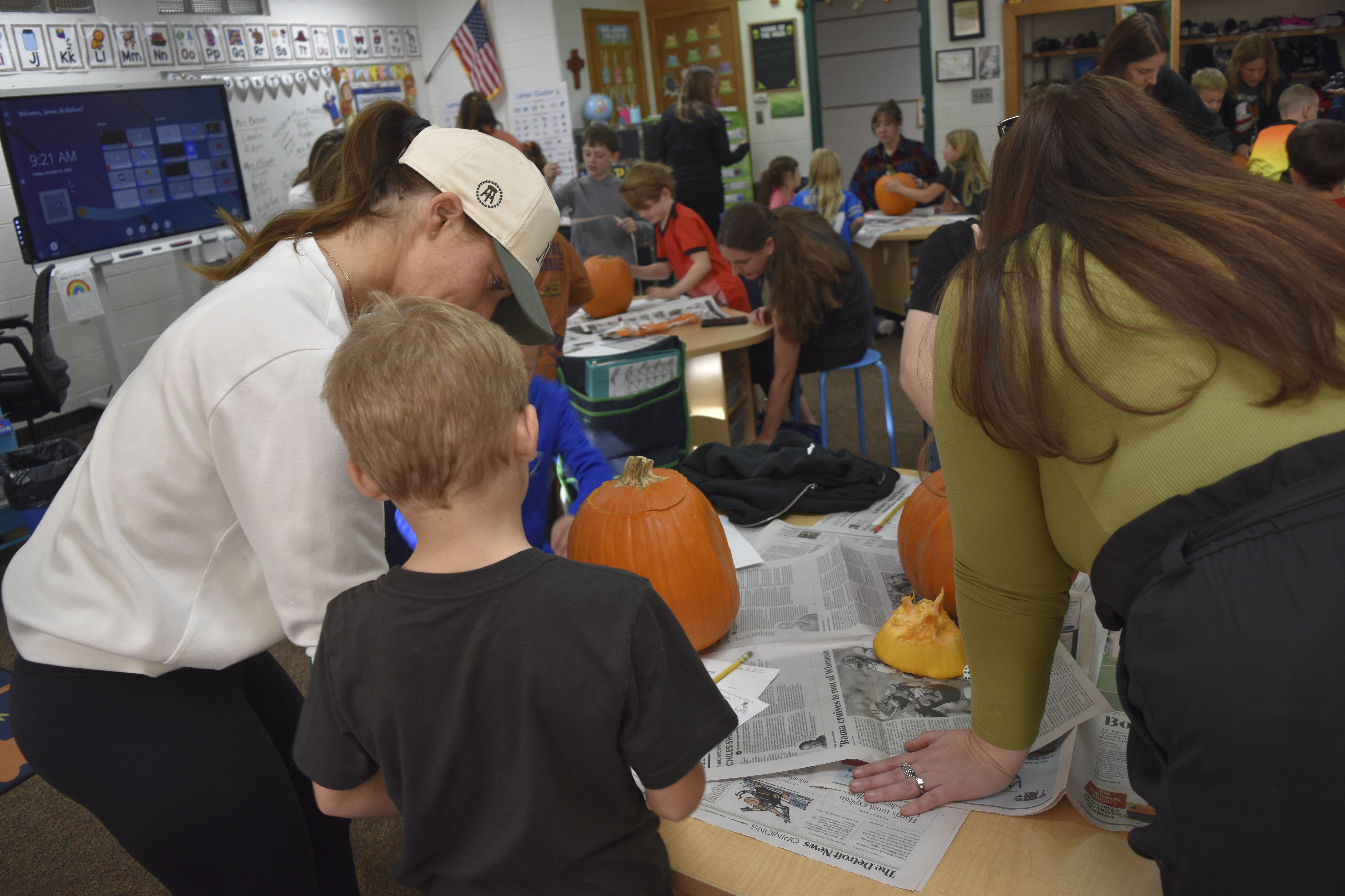 Students were divided into groups to work hands on with a pumpkin and overseen by parent volunteers. The students measured the pumpkins with tape measures, weighed their pumpkins on scales and then, the parent volunteers cut off the tops so the kids could see what was inside. They smelled the inside, touched the content and wrote down a description of what they found. Then came the hard work, they scraped the pumpkins out and separated the seeds. Grouping them into piles of fives, the students counted the seeds. One pumpkin provided so many opportunities for students to learn.