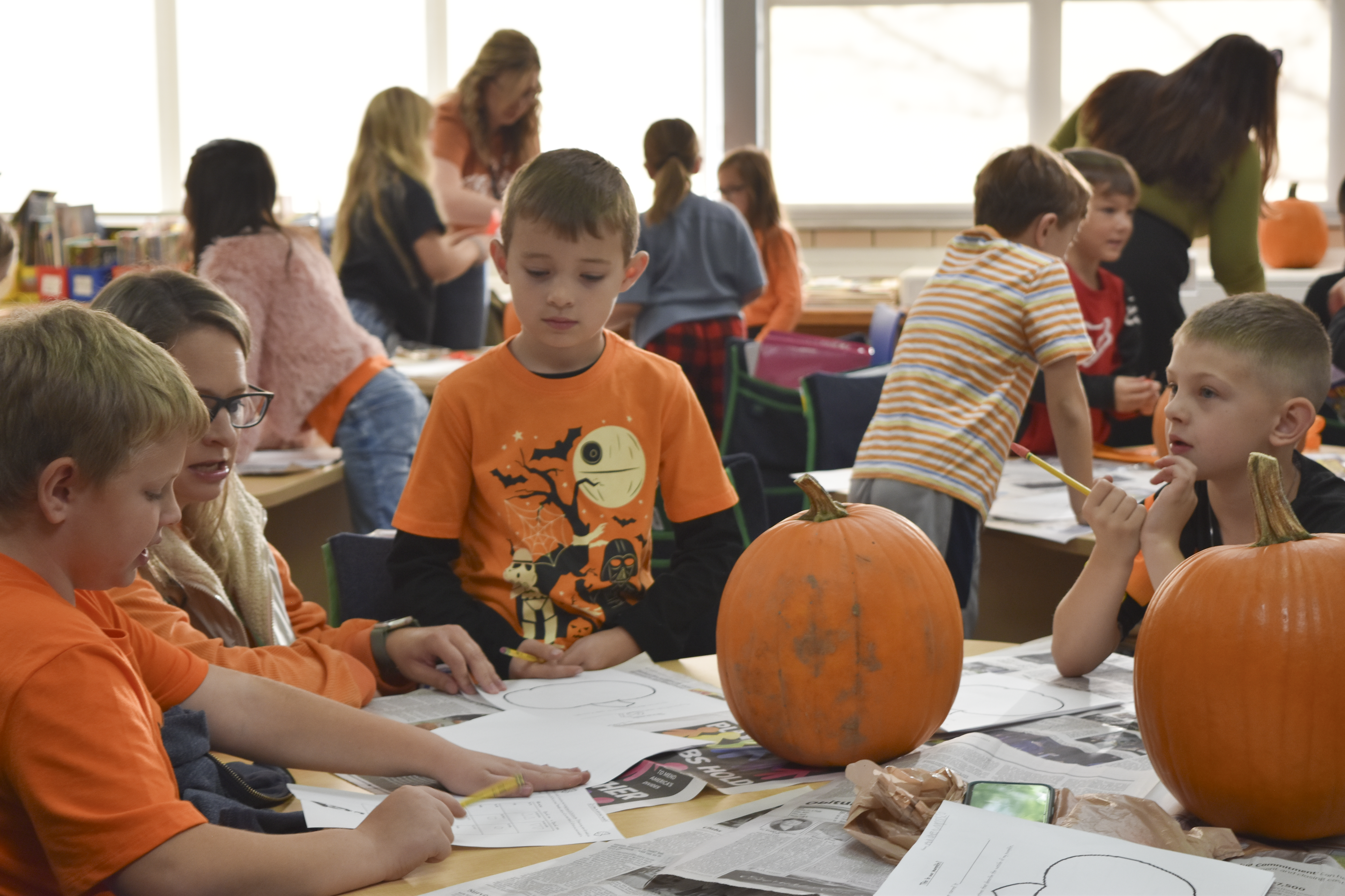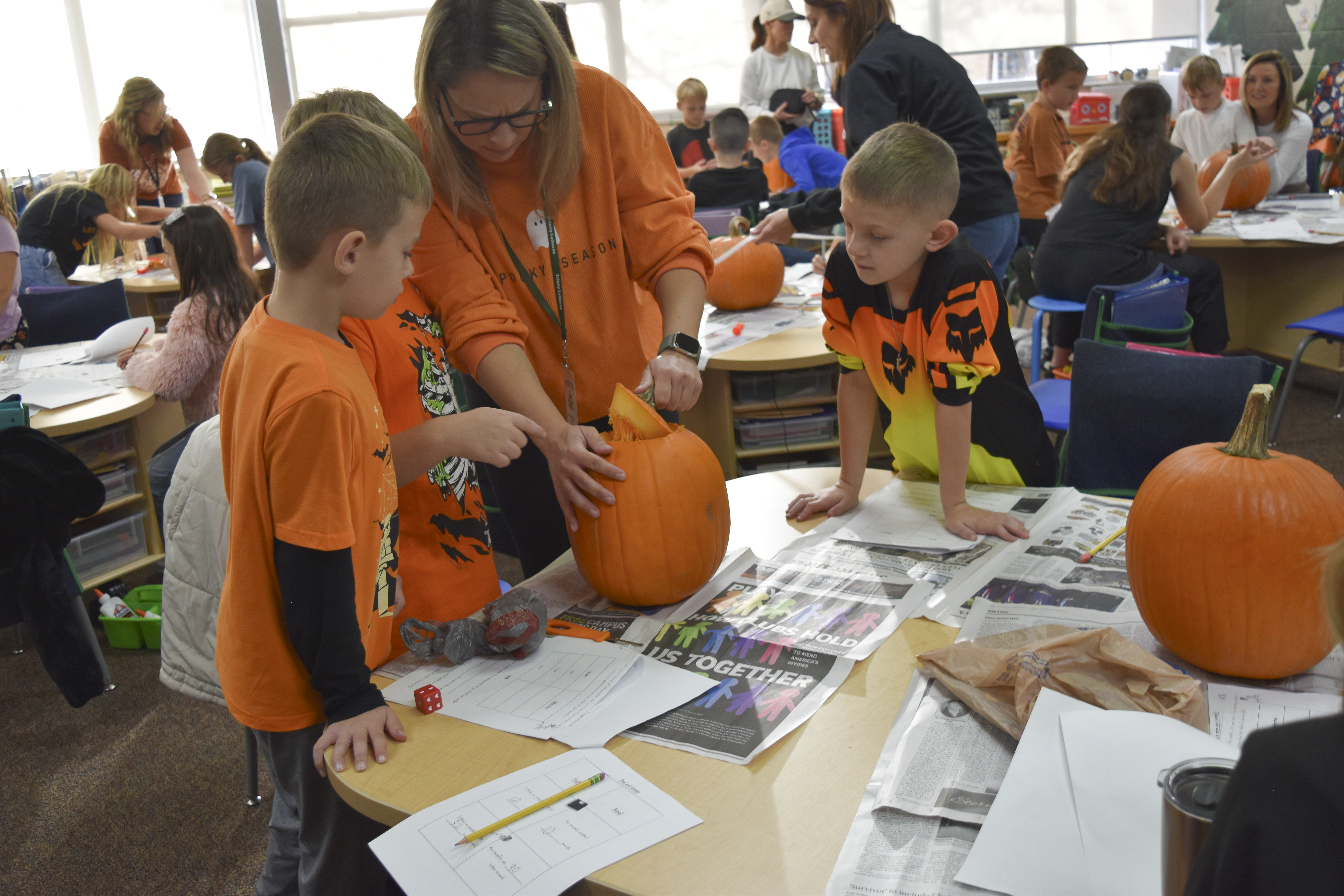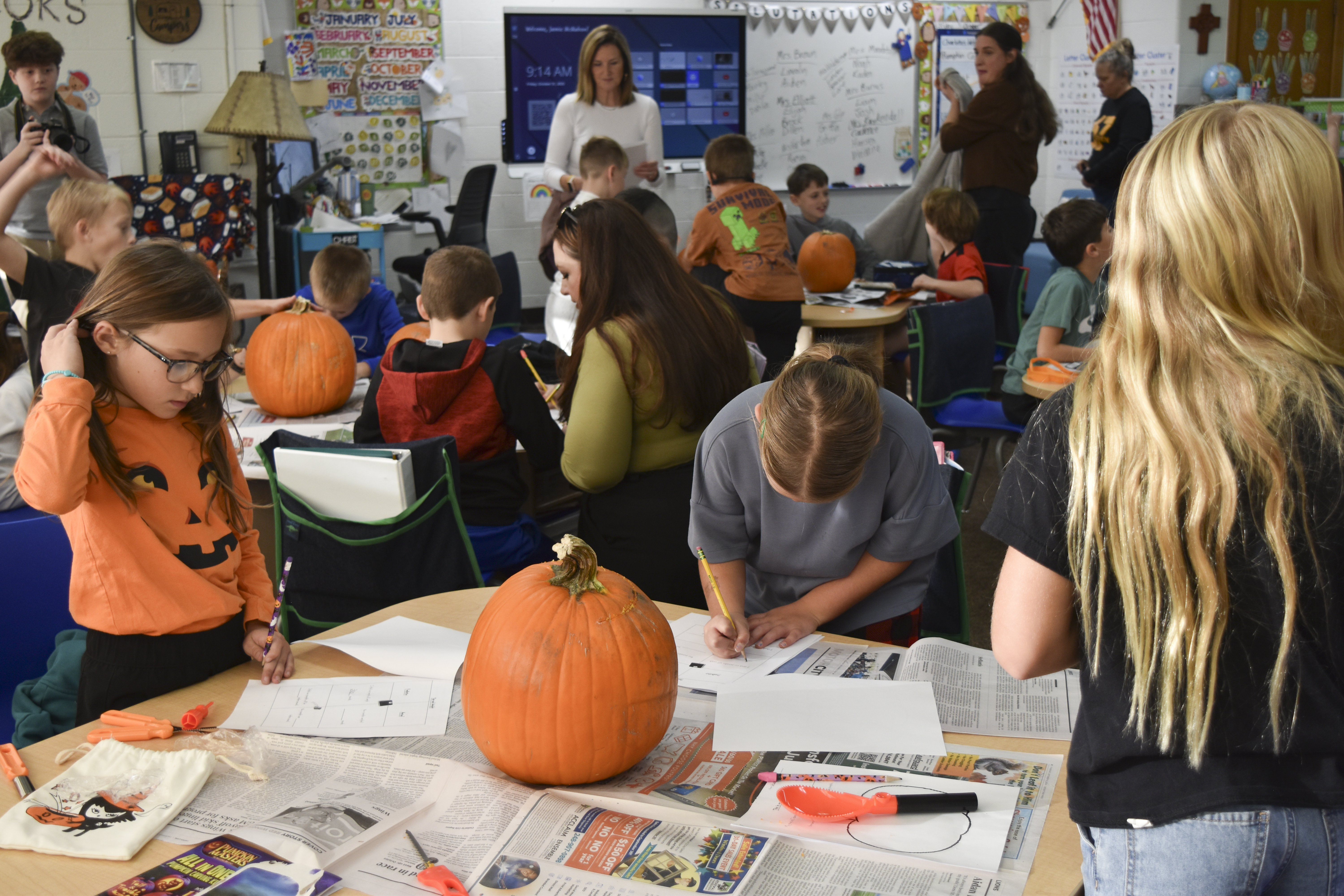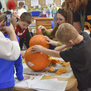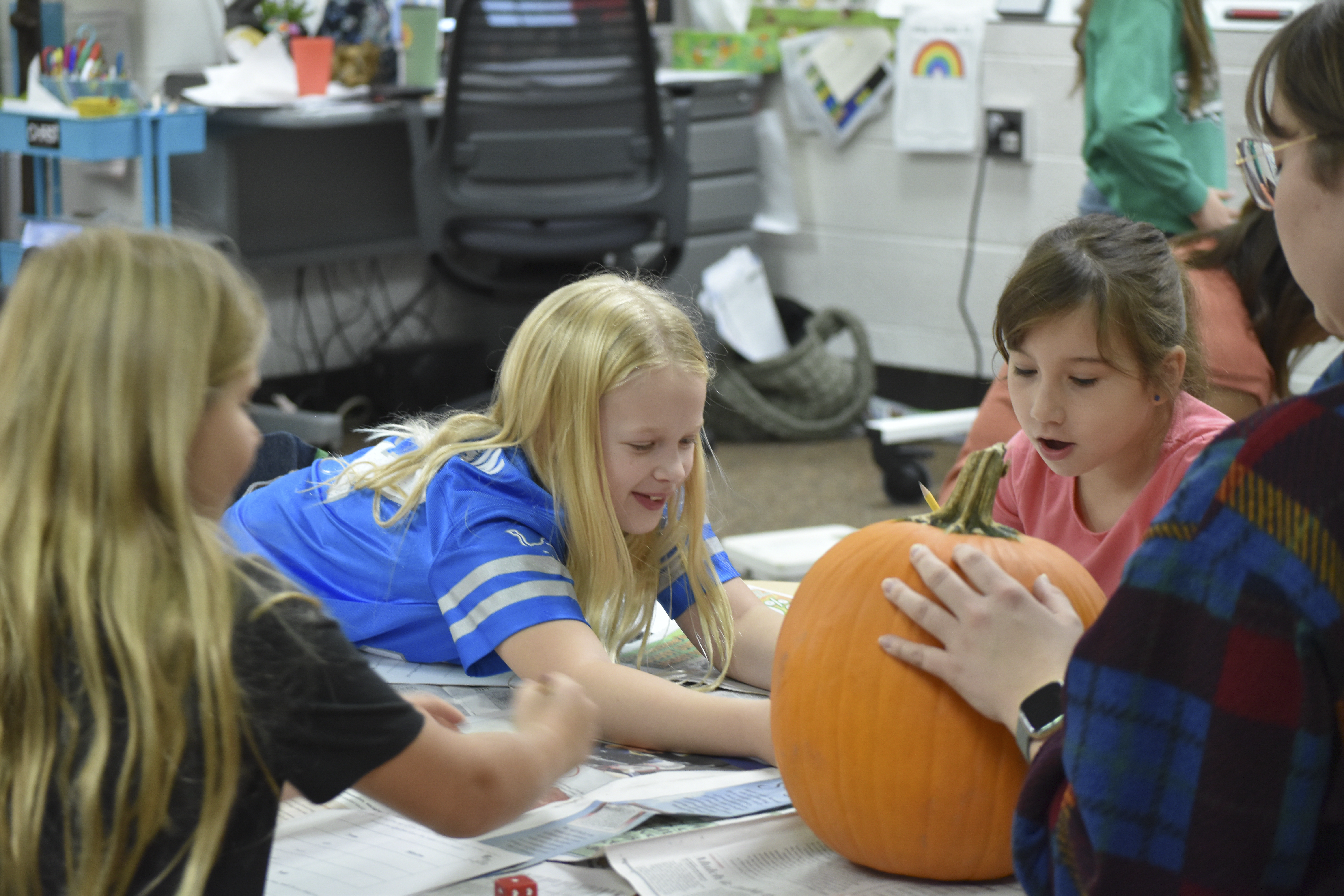 Students were divided into groups to work hands on with a pumpkin and overseen by parent volunteers. The students measured the pumpkins with tape measures, weighed their pumpkins on scales and then, the parent volunteers cut off the tops so the kids could see what was inside. They smelled the inside, touched the content and wrote down a description of what they found. Then came the hard work, they scraped the pumpkins out and separated the seeds. Grouping them into piles of fives, the students counted the seeds. One pumpkin provided so many opportunities for students to learn.
