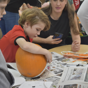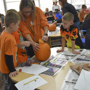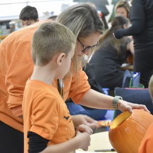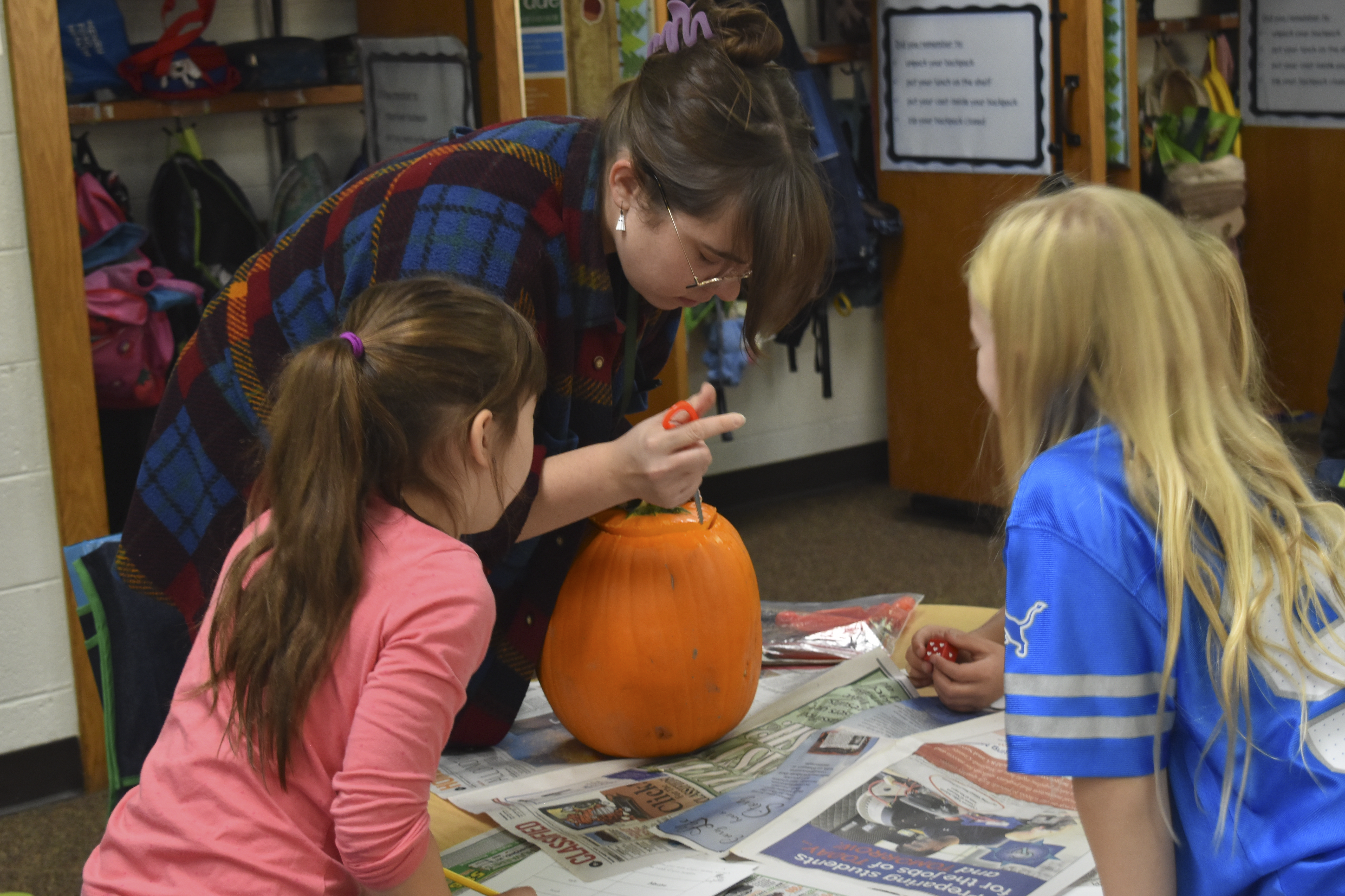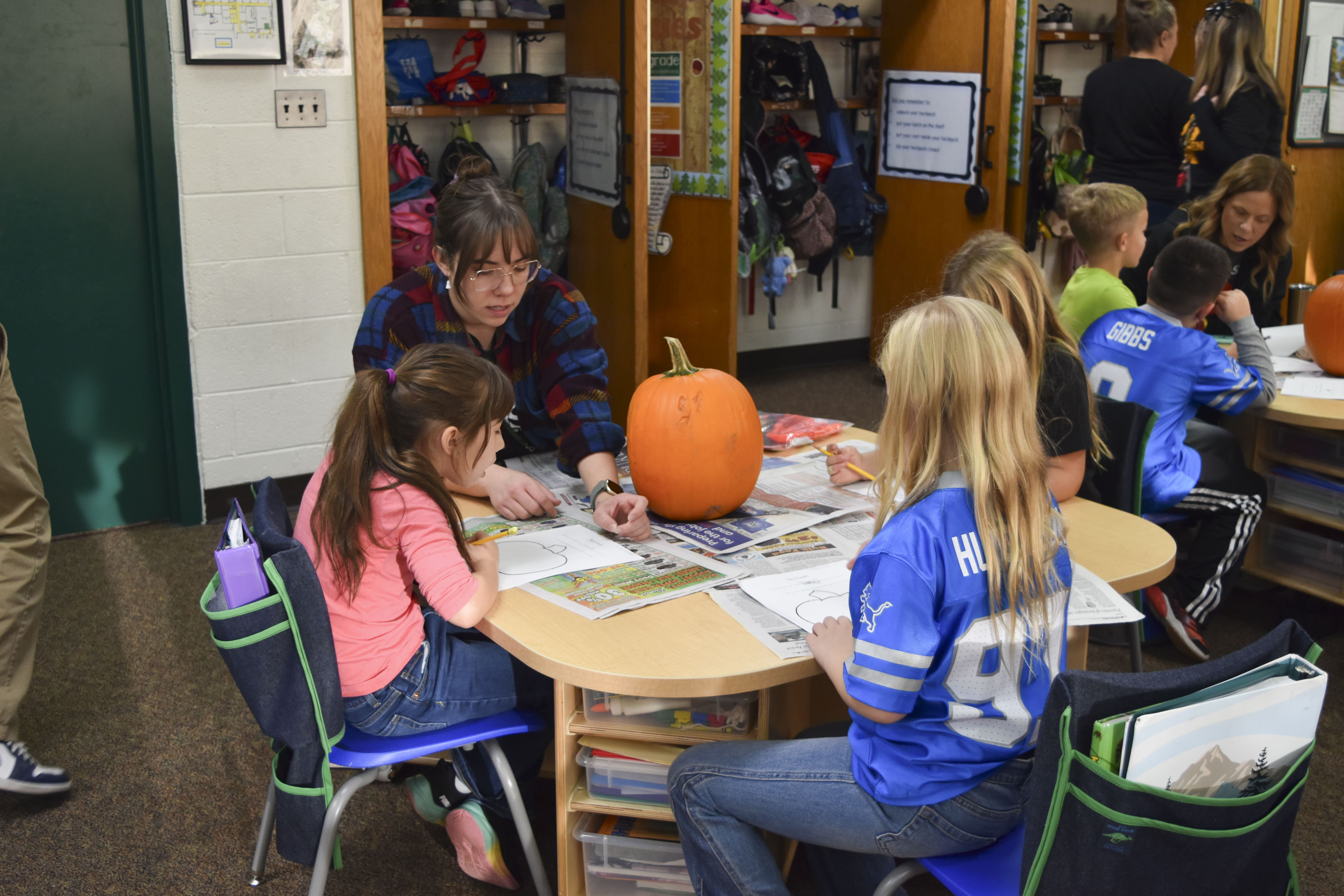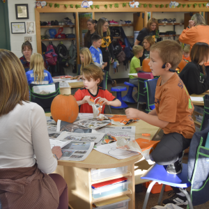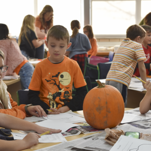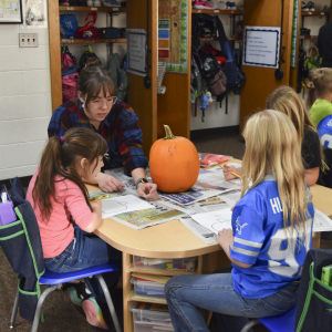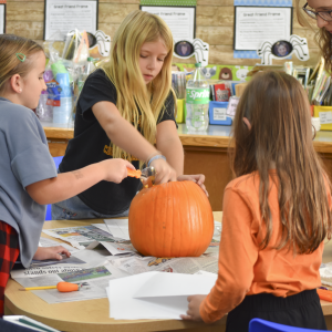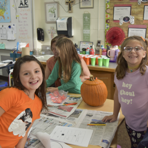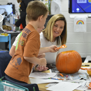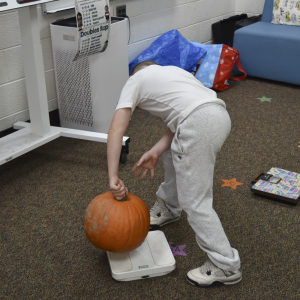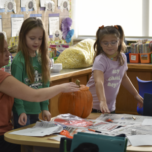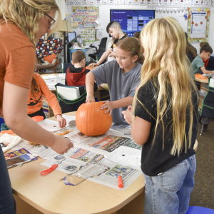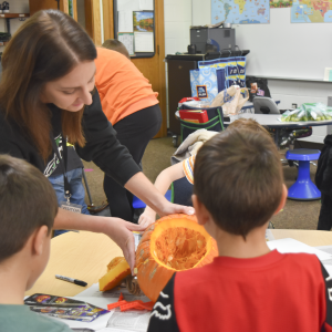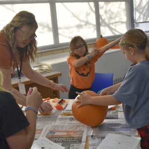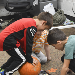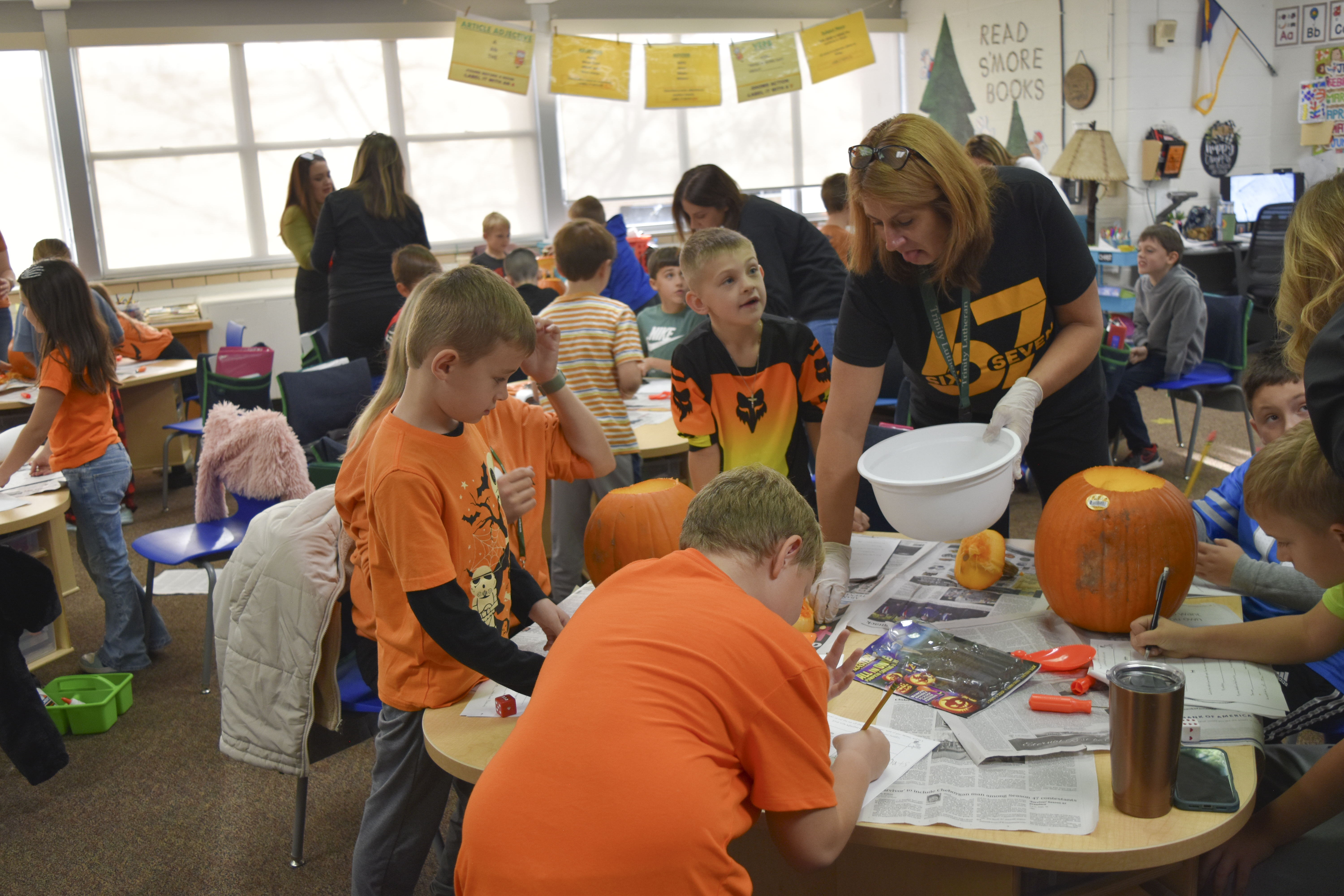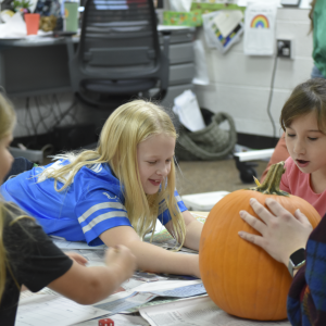 Students were divided into groups to work hands on with a pumpkin and overseen by parent volunteers. The students measured the pumpkins with tape measures, weighed their pumpkins on scales and then, the parent volunteers cut off the tops so the kids could see what was inside. They smelled the inside, touched the content and wrote down a description of what they found. Then came the hard work, they scraped the pumpkins out and separated the seeds. Grouping them into piles of fives, the students counted the seeds. One pumpkin provided so many opportunities for students to learn.