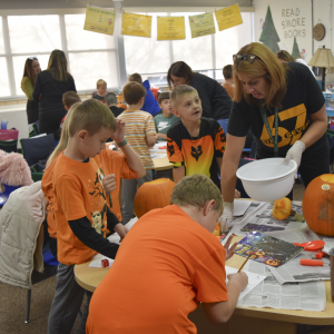 After the pumpkin centers were complete, the students and the parent volunteers enjoyed cider and donuts. Teacher aide Debi Puchalski also collected a number of the seeds and roasted them for the students to try.