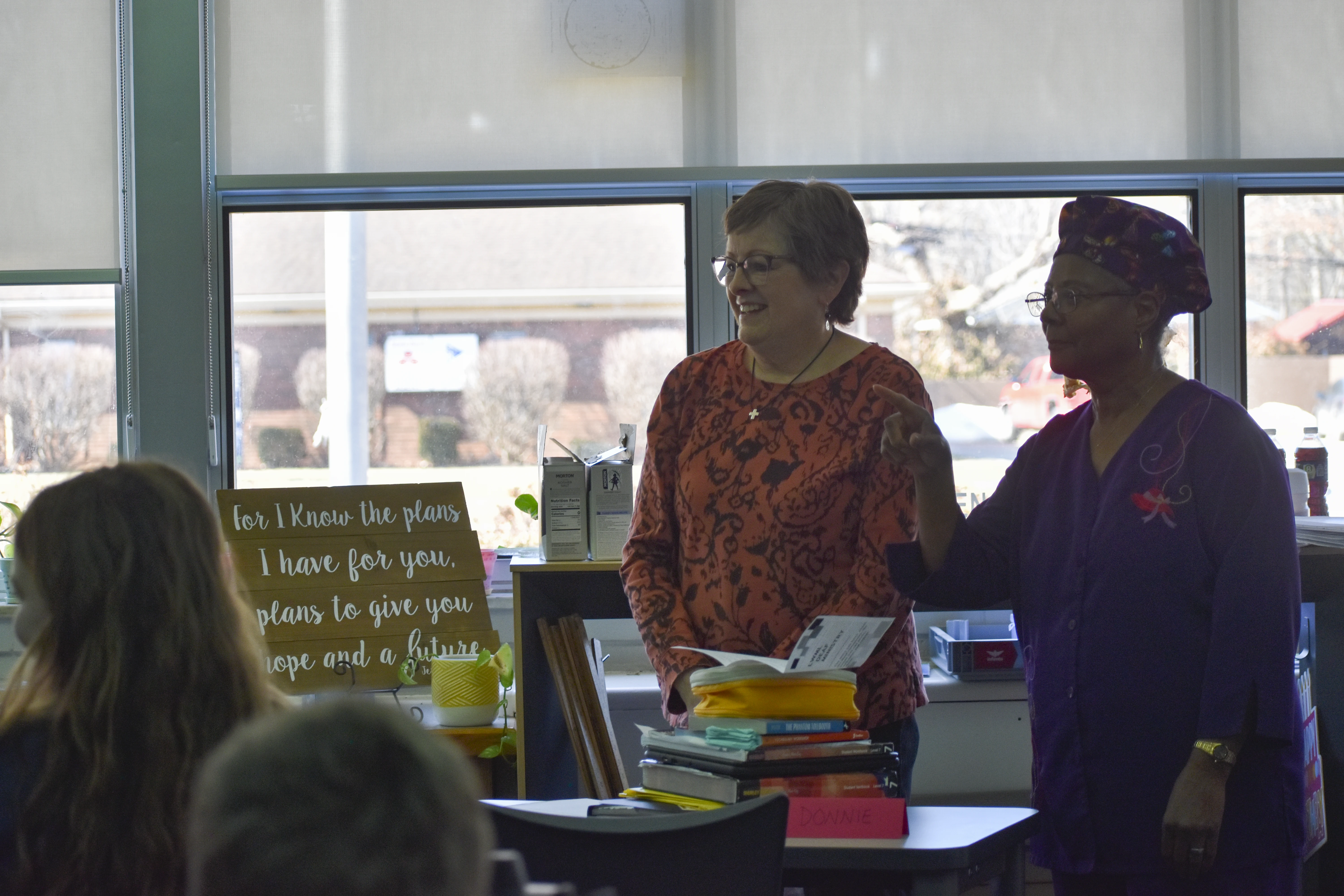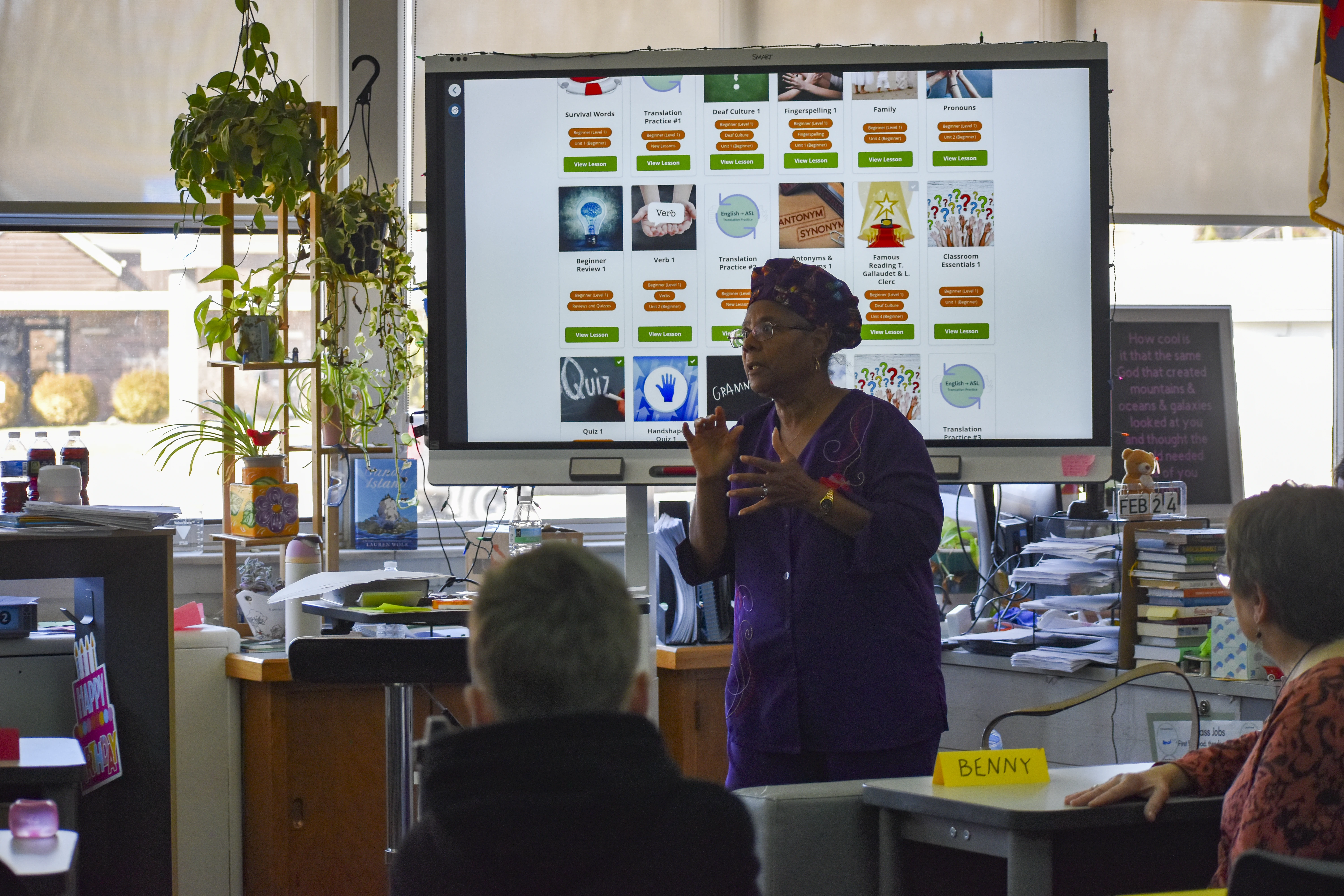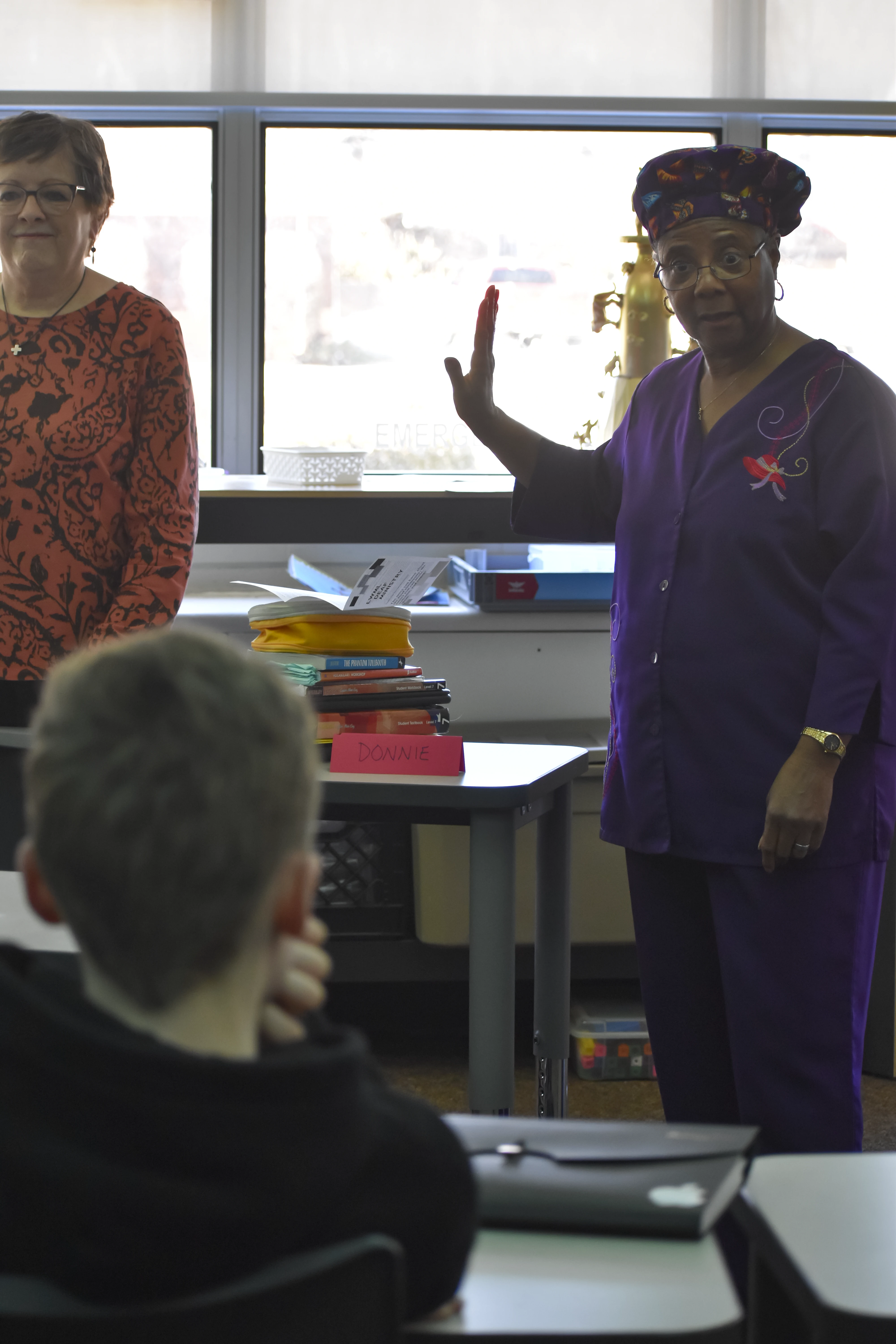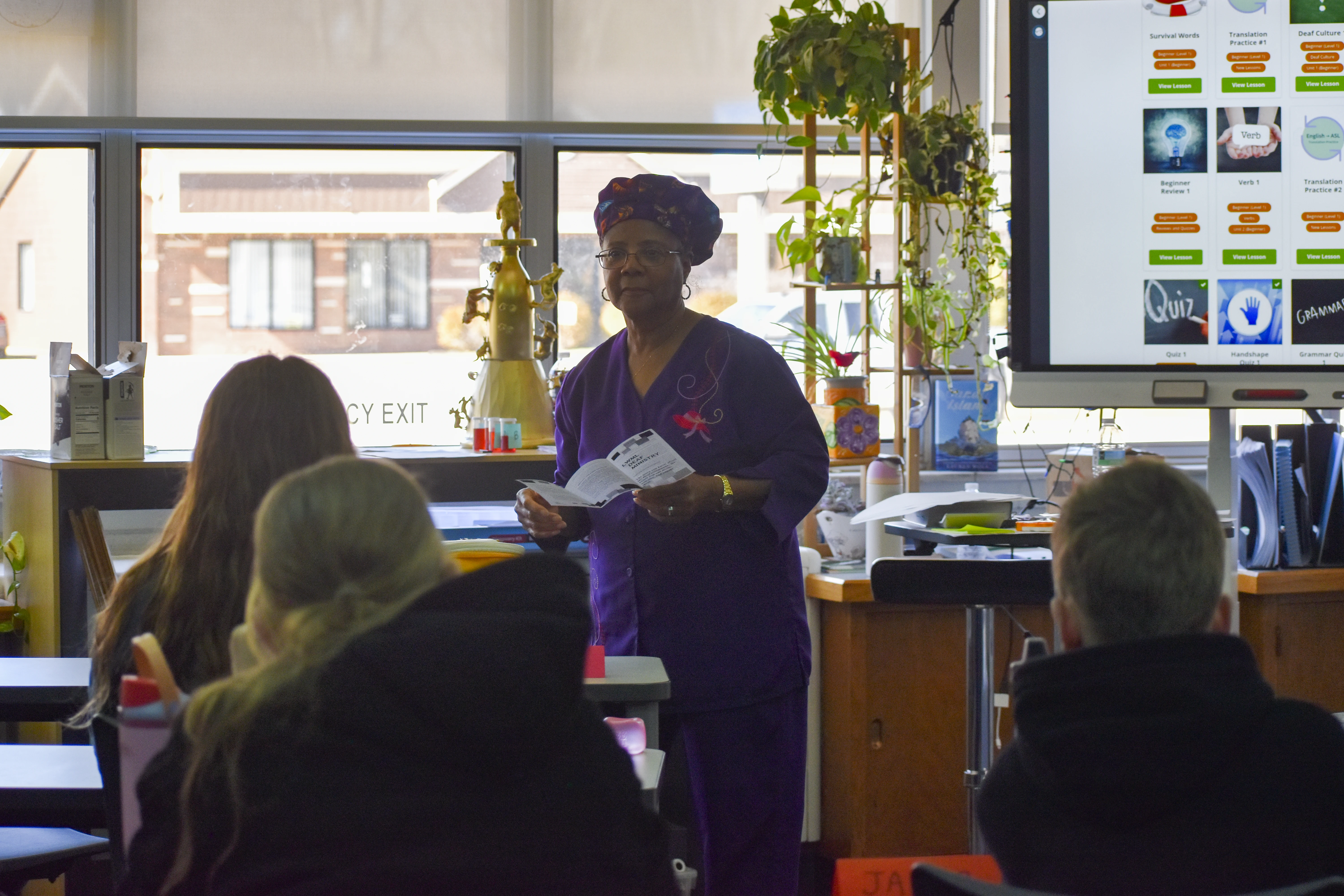 Since the beginning of the semester, students in the ASL elective have been working with retired Trinity teacher Joanne Brown to learn the language and practice communicating and even "singing" in sign language. On Wednesday, Feb. 26, the group performed the song "Our God Is an Awesome God" during chapel. Then they put their skills to use communicating with Wolff when she visited their class two days later.