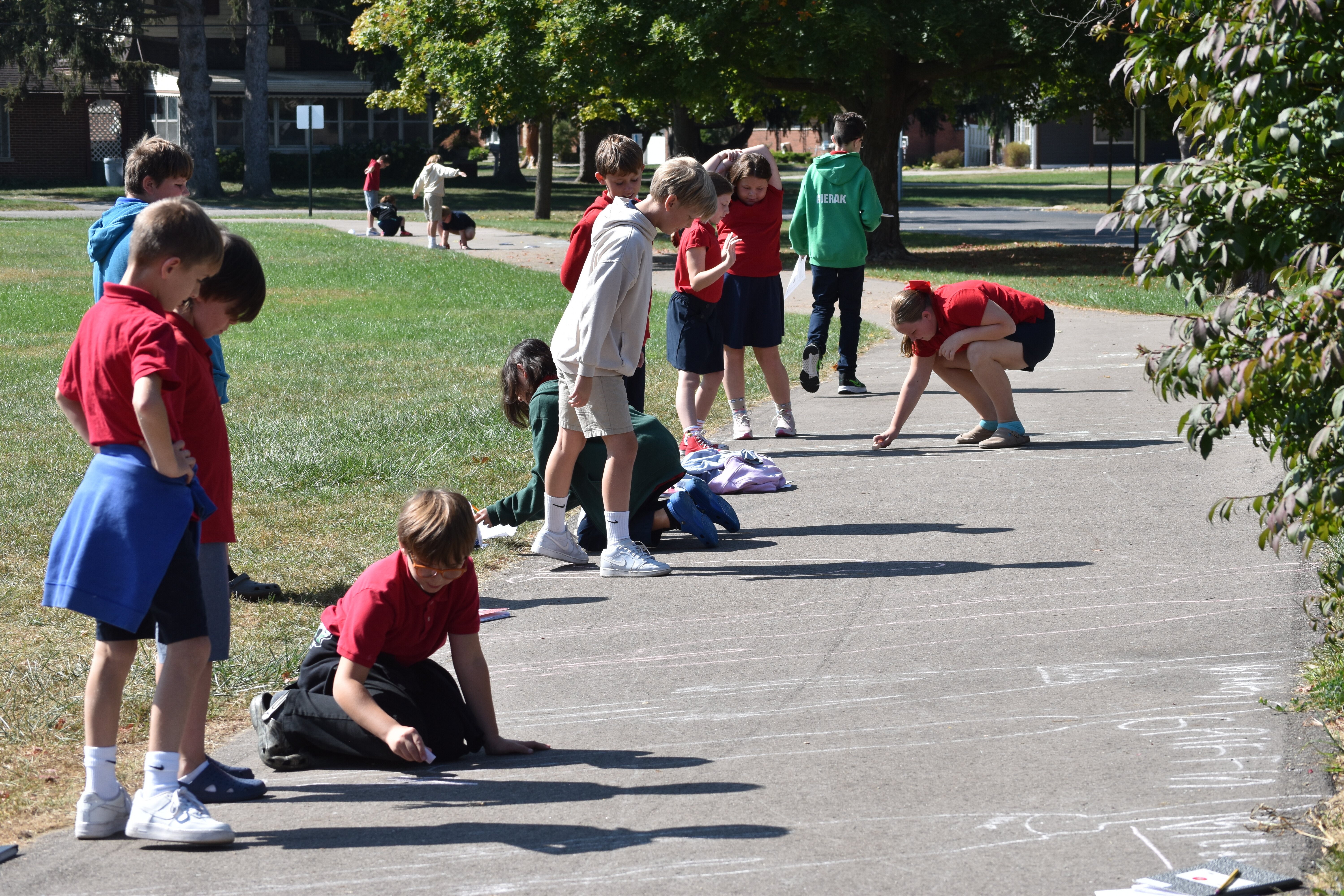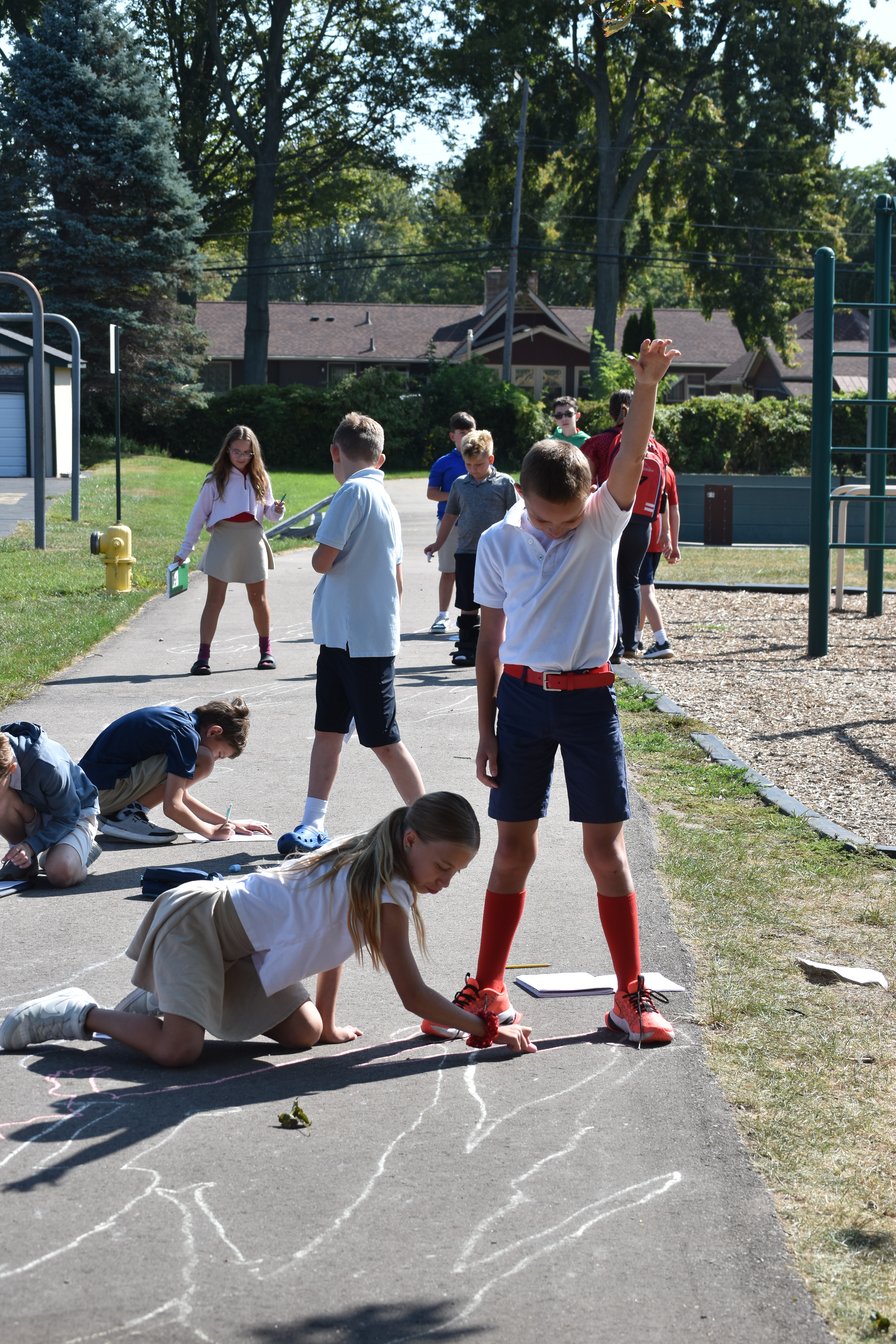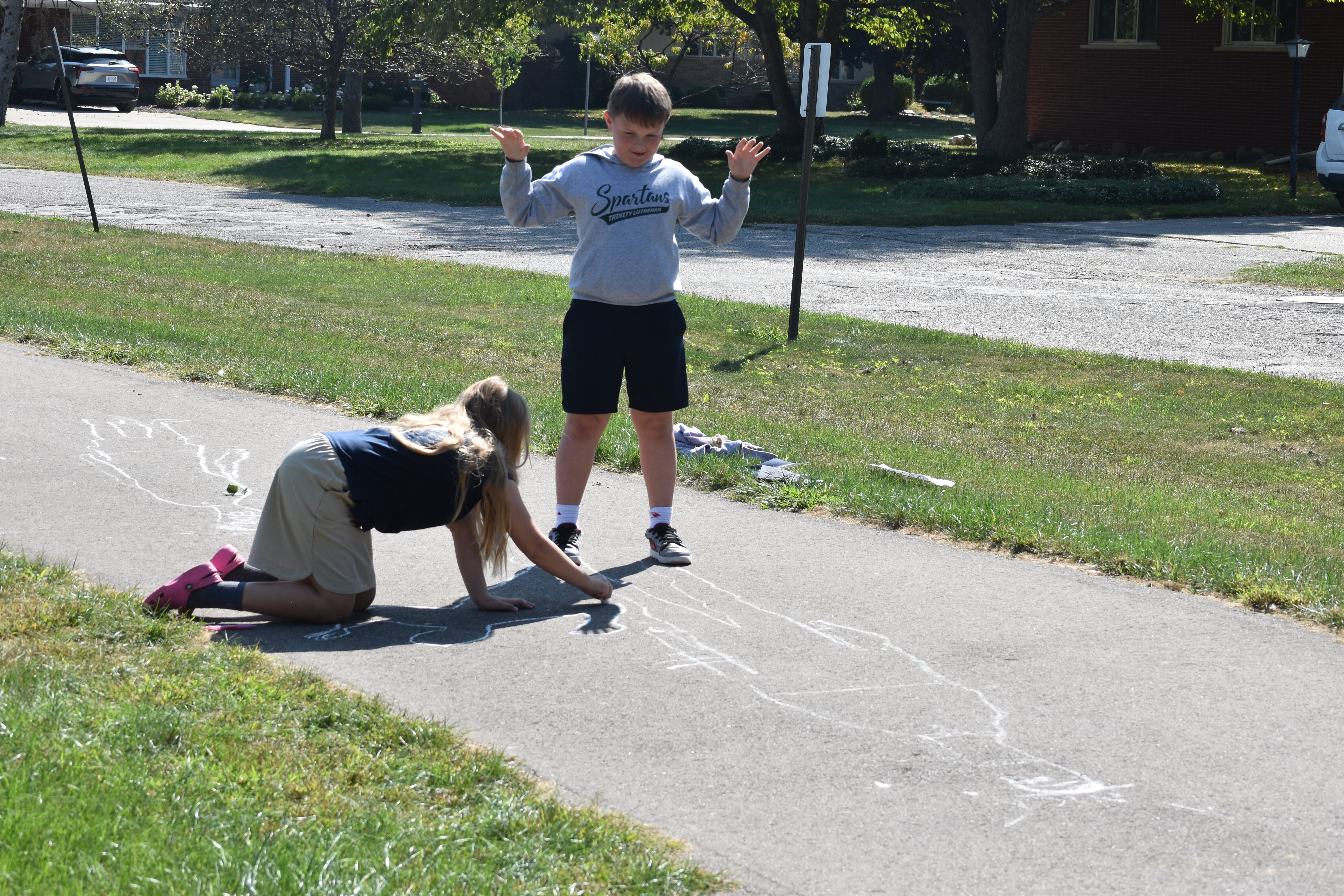 Fifth grade scientists at Trinity recently took their learning outside for a hands-on experiment led by science teacher Claire Maser. As part of their unit on the sun, students headed to the walking track early one sunny morning to observe how sunlight affects their shadows. Working in groups, they stood in a marked spot and used sidewalk chalk to trace the outline of each other’s shadows on the pavement.