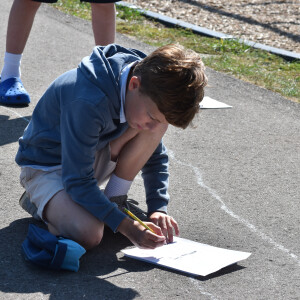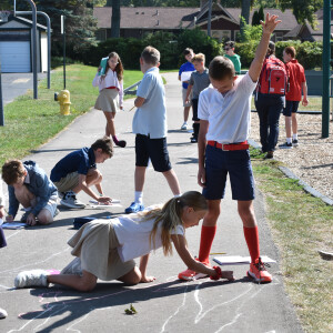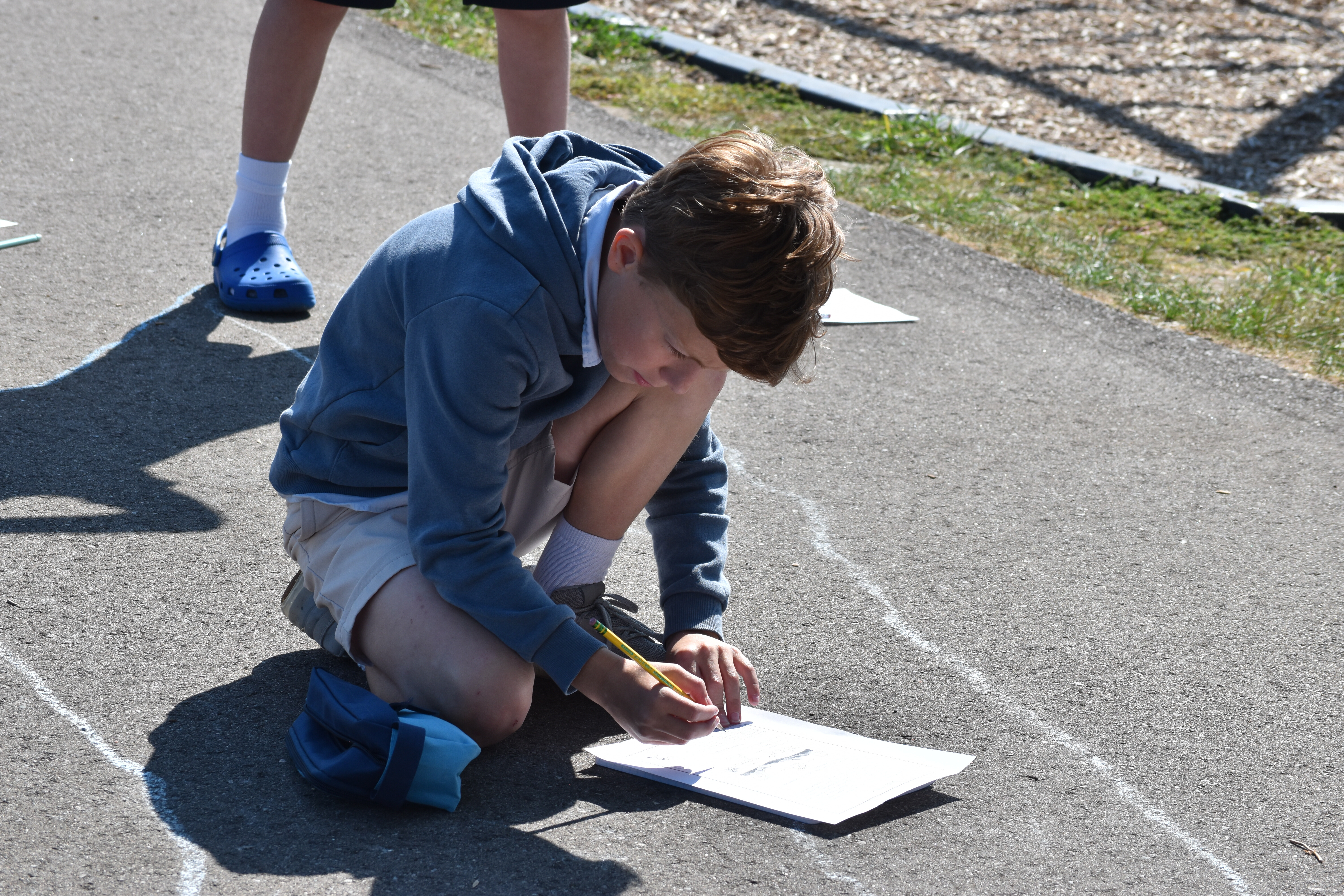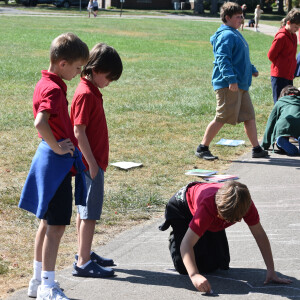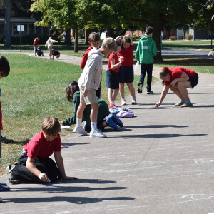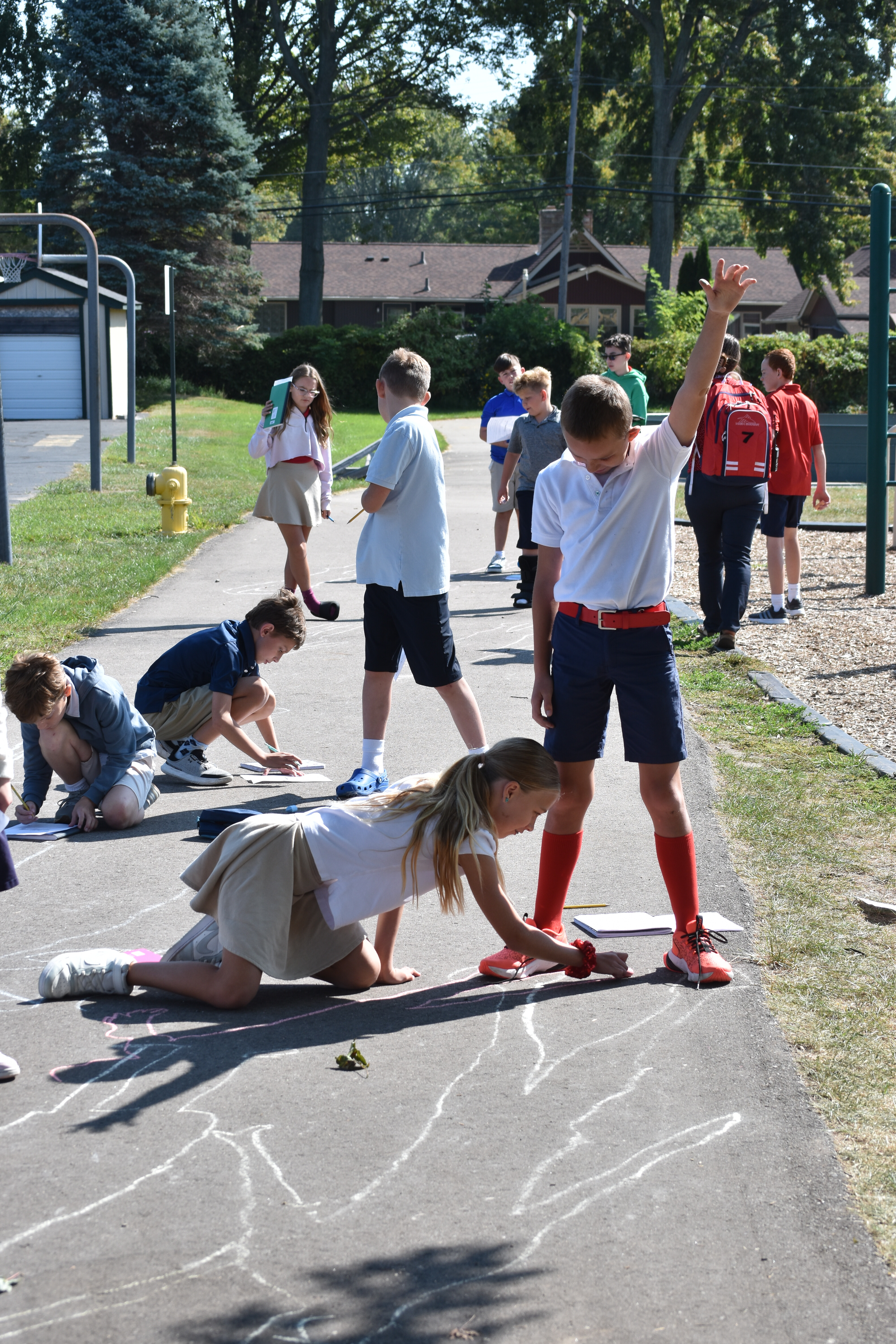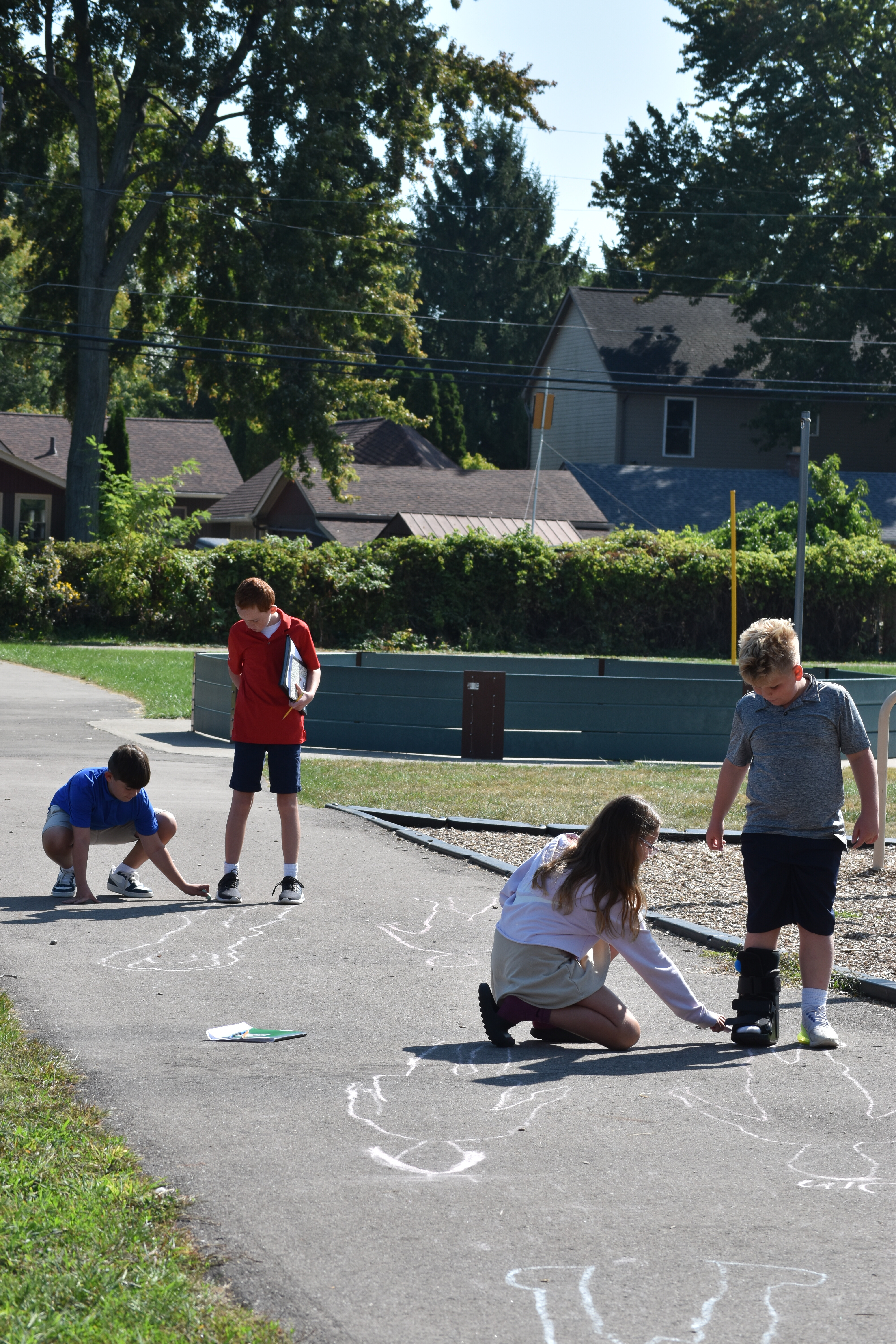 Fifth grade scientists at Trinity recently took their learning outside for a hands-on experiment led by science teacher Claire Maser. As part of their unit on the sun, students headed to the walking track early one sunny morning to observe how sunlight affects their shadows. Working in groups, they stood in a marked spot and used sidewalk chalk to trace the outline of each other’s shadows on the pavement.