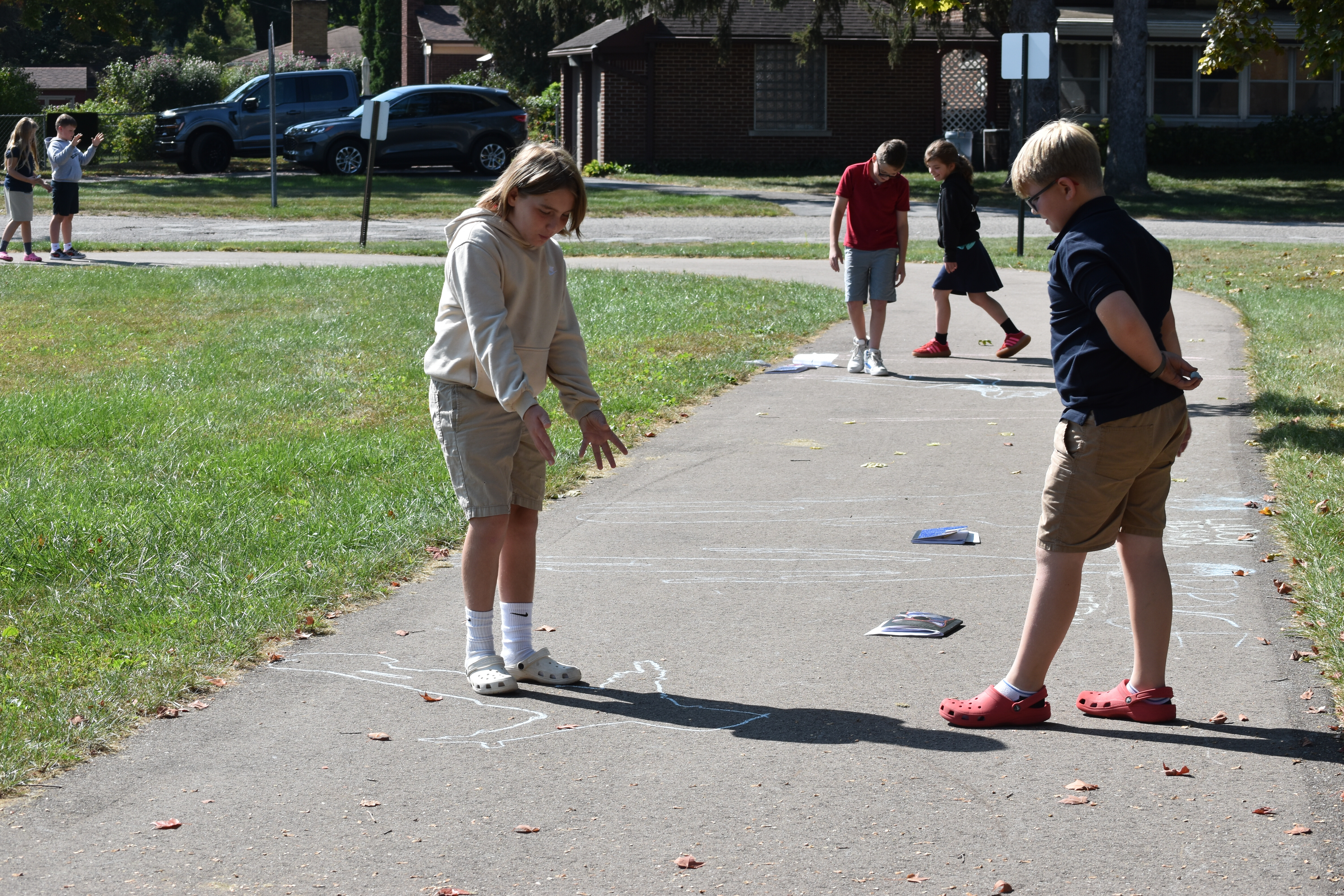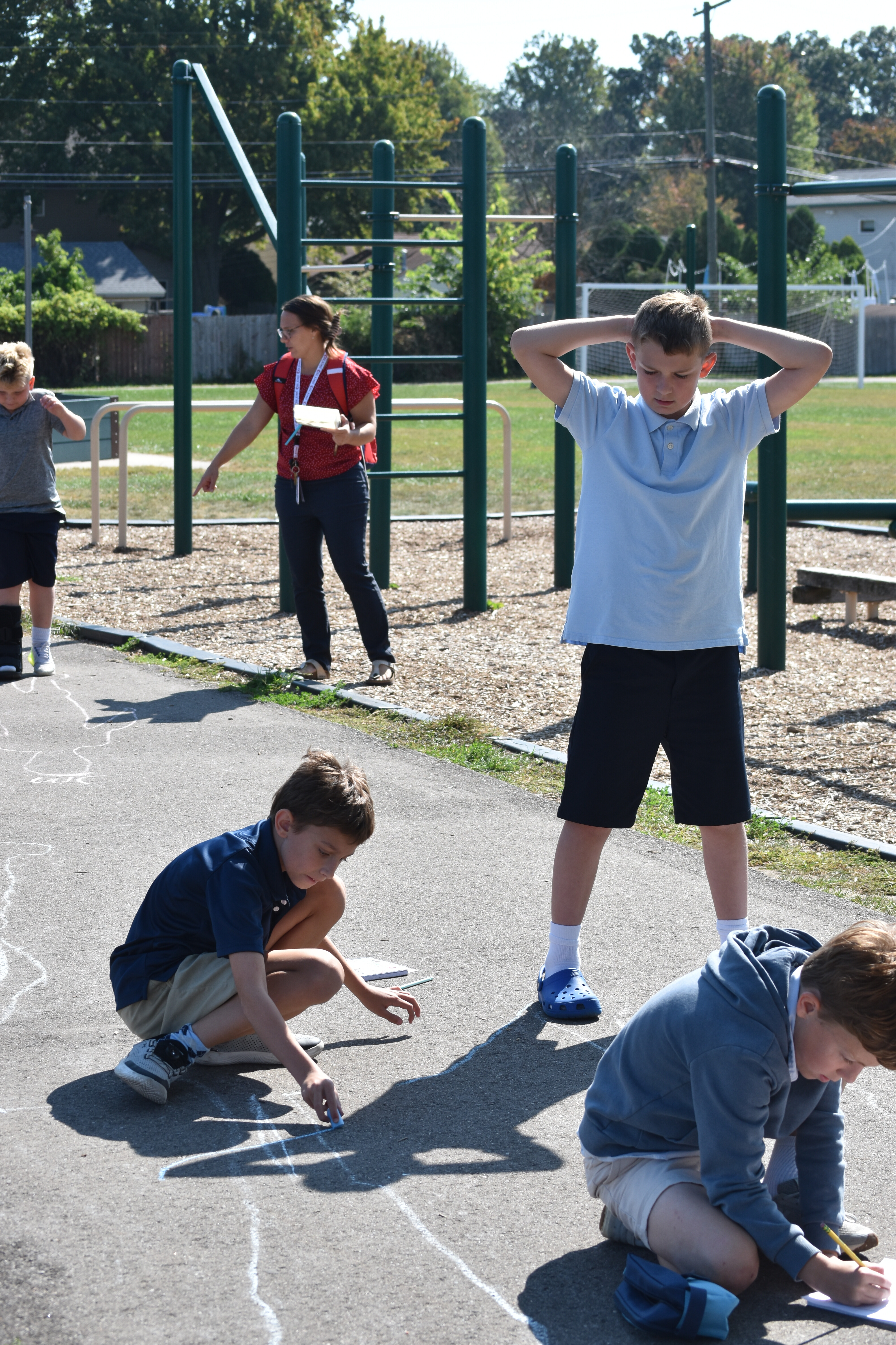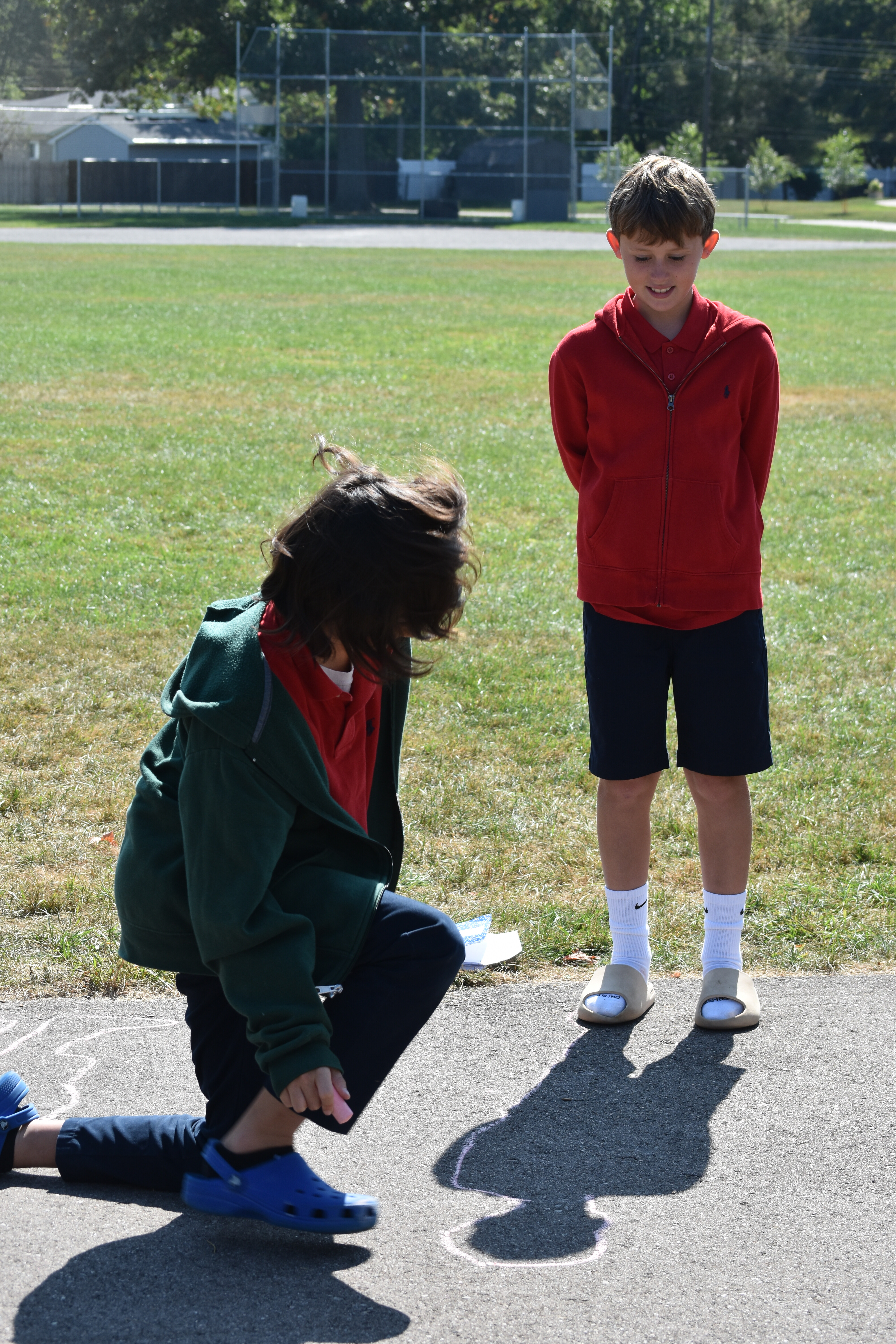 Later that same day, Mrs. Maser brought the class back out to check on their chalk outlines. Students noted how much their shadows had shifted and changed shape in just a few hours. This prompted discussions about the position of the sun in the sky and how it influences the length and direction of shadows.