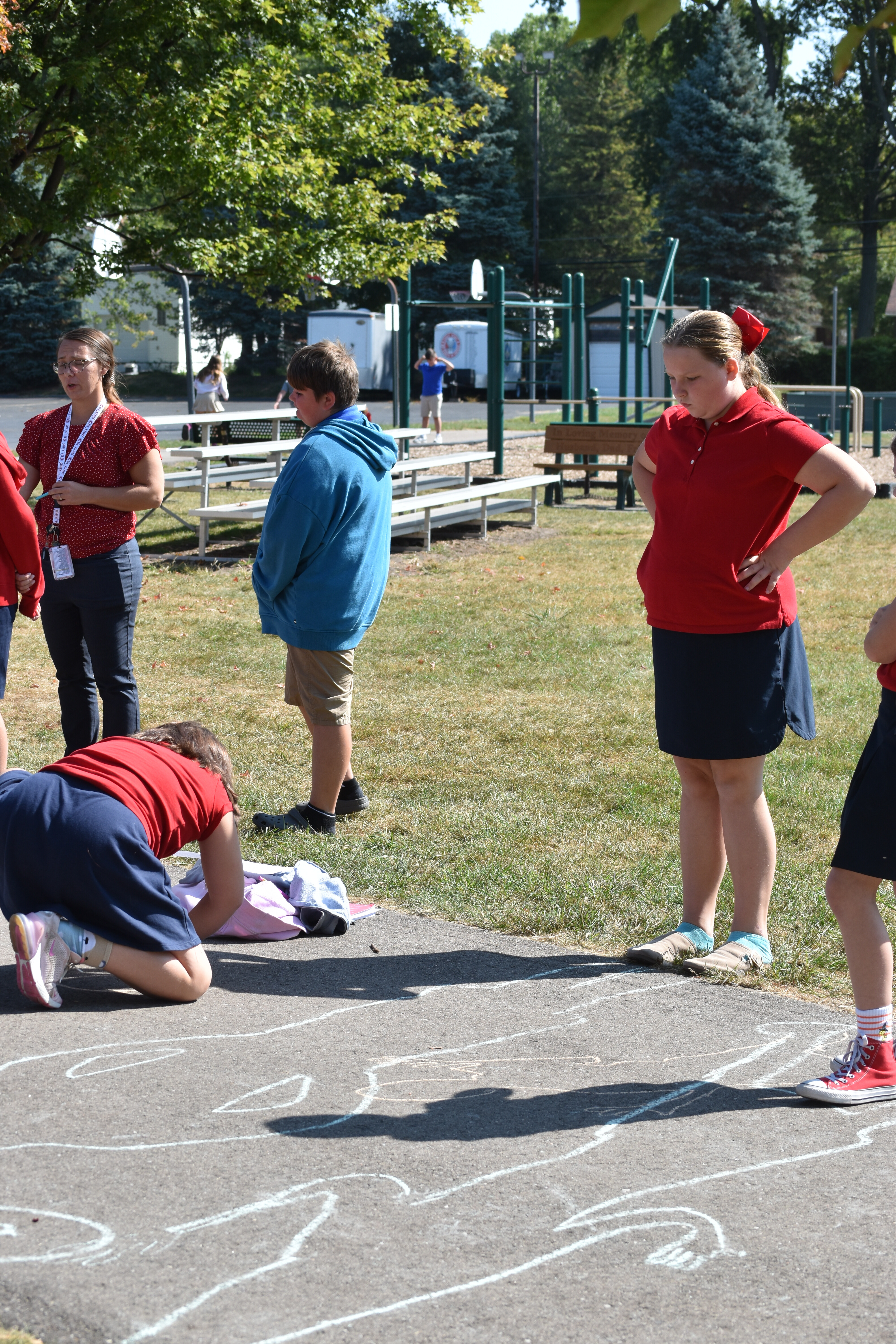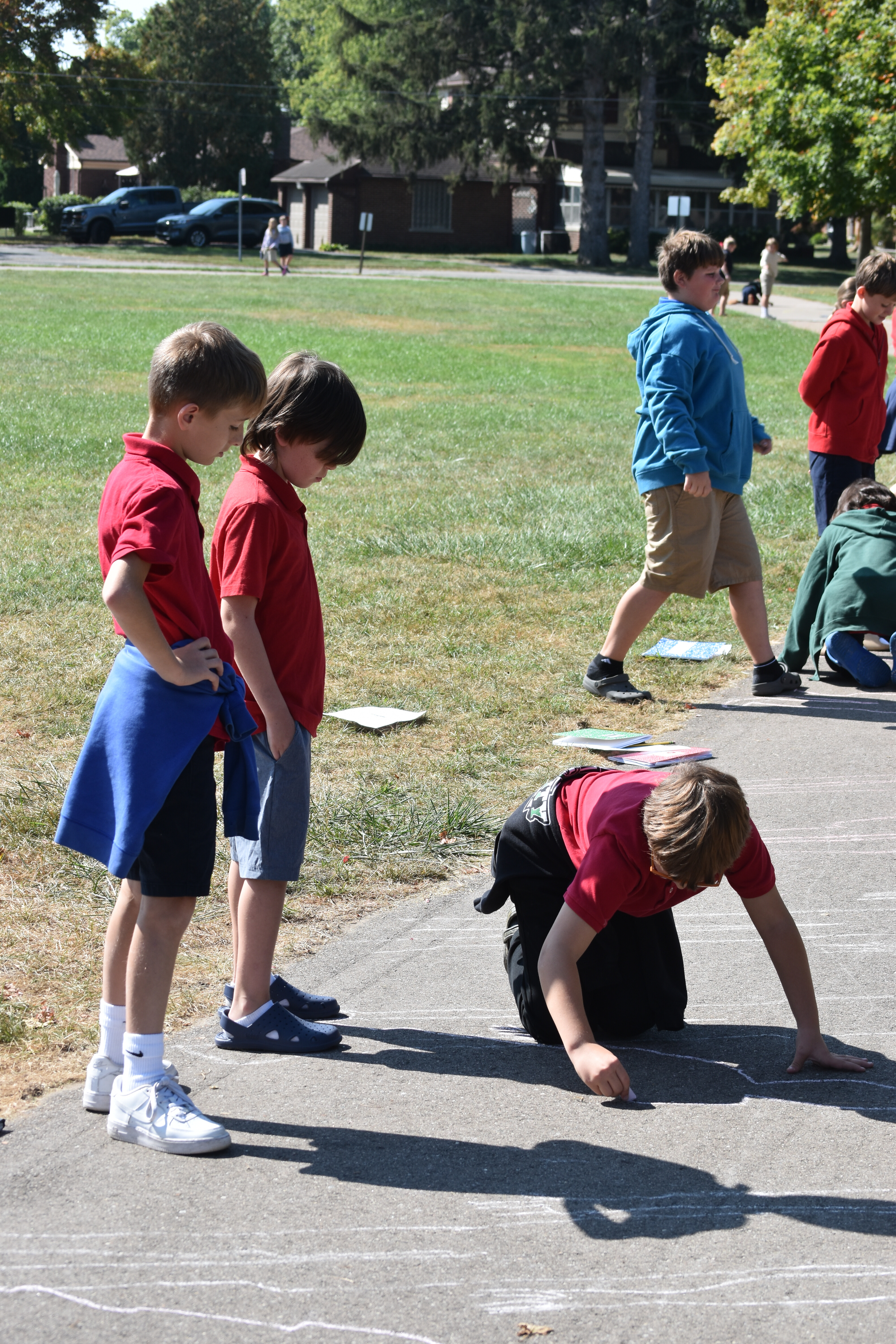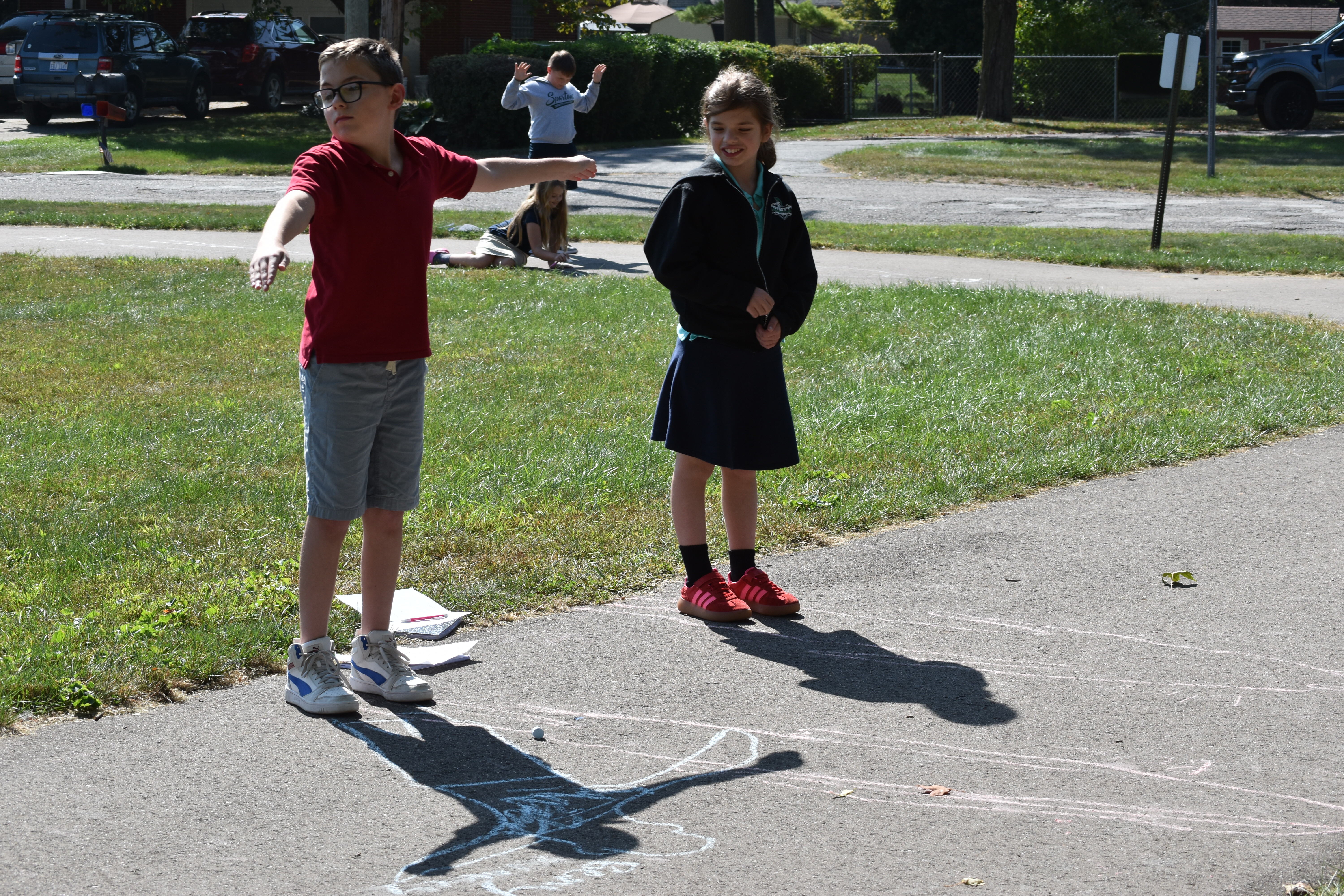 Later that same day, Mrs. Maser brought the class back out to check on their chalk outlines. Students noted how much their shadows had shifted and changed shape in just a few hours. This prompted discussions about the position of the sun in the sky and how it influences the length and direction of shadows.